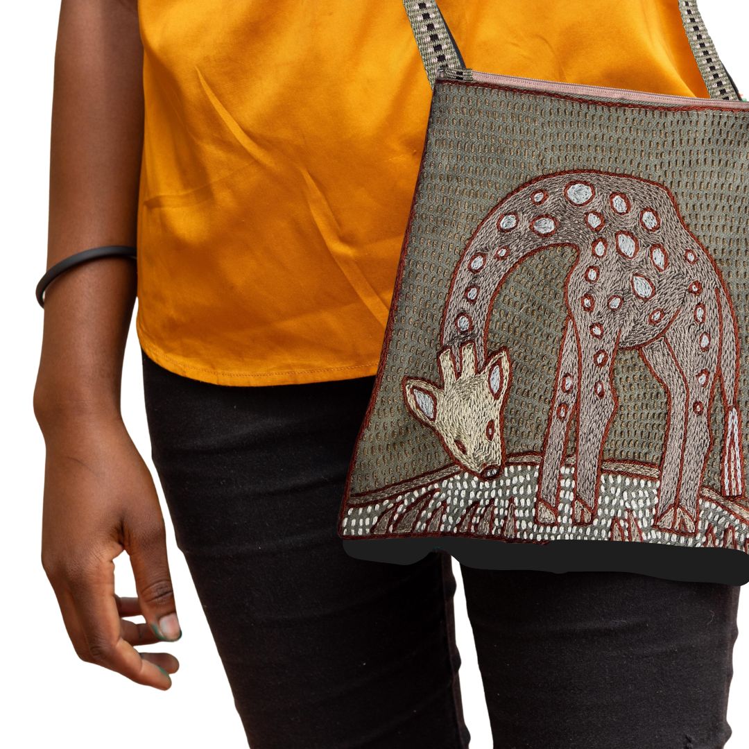 The Olivia bag is a one-of-a-kind, functional artwork. While the design is repeated within the collection, each piece is individually interpreted by our skilled embroiderers—carefully combining colours and stitches to create a truly unique item. This design features African animals and forms part of our Namib Rust colour range.