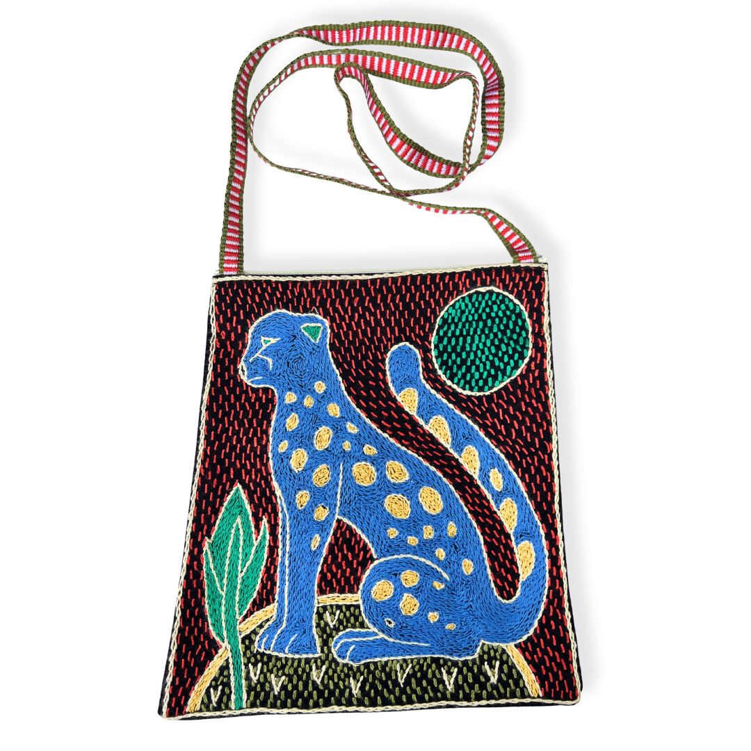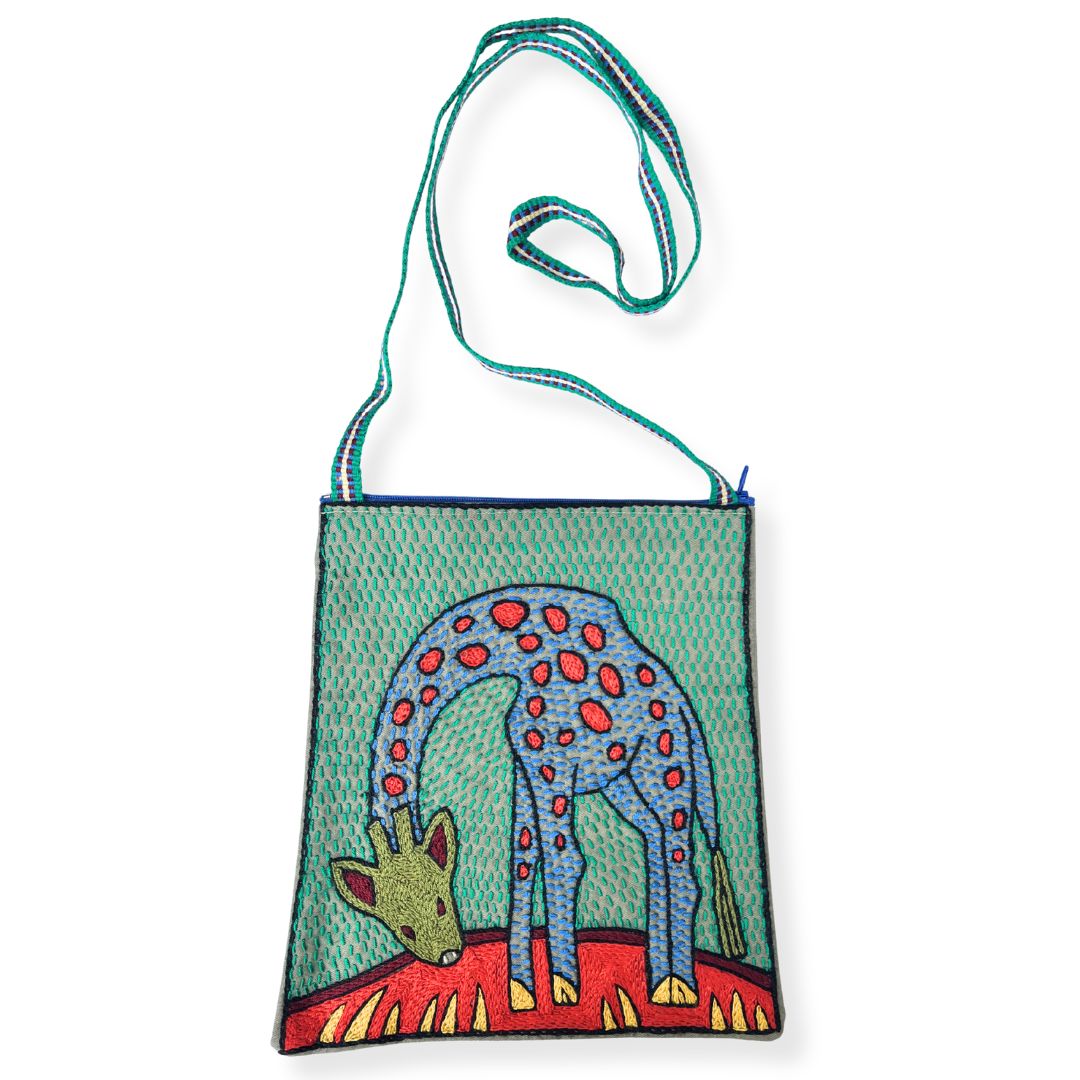 The Olivia bag is a one-of-a-kind, functional artwork. While the design is repeated within the collection, each piece is individually interpreted by our skilled embroiderers—carefully combining colours and stitches to create a truly unique item. This design features African animals and forms part of our Viva Africa colour range.
