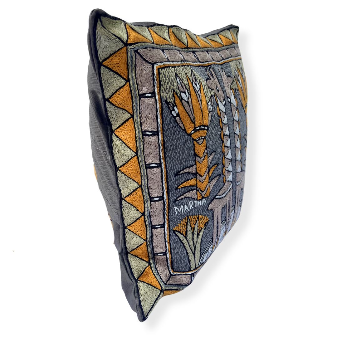 This cushion cover is a one-of-a-kind artwork. While the design is repeated within the collection, our skilled embroiderers interpret each piece individually, combining colors and stitches to create a truly unique item. The artwork features African animals, beautifully framed with the Kaross Signature geometric borders.