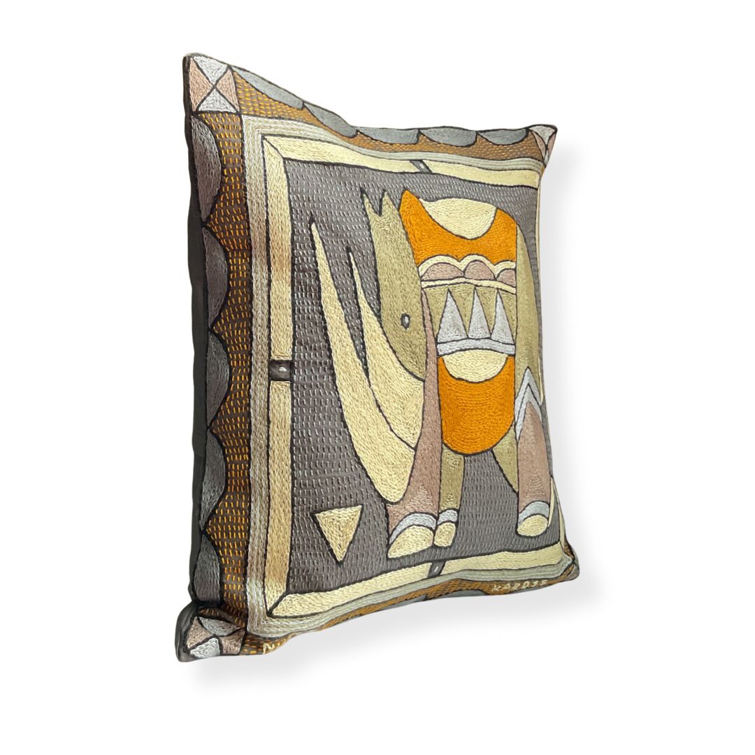 This cushion cover is a one-of-a-kind artwork. While the design is repeated within the collection, our skilled embroiderers interpret each piece individually, combining colors and stitches to create a truly unique item. The artwork features African animals, beautifully framed with the Kaross Signature geometric borders.