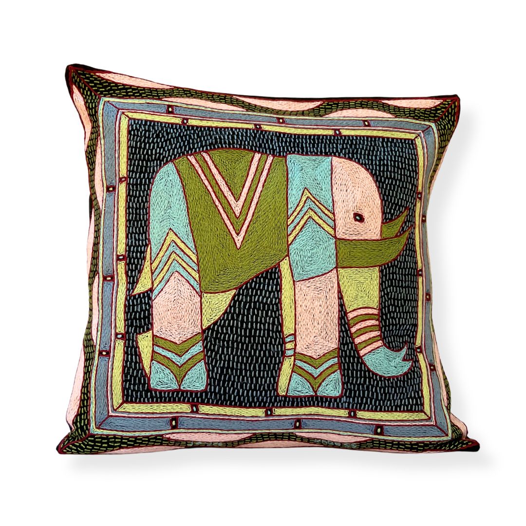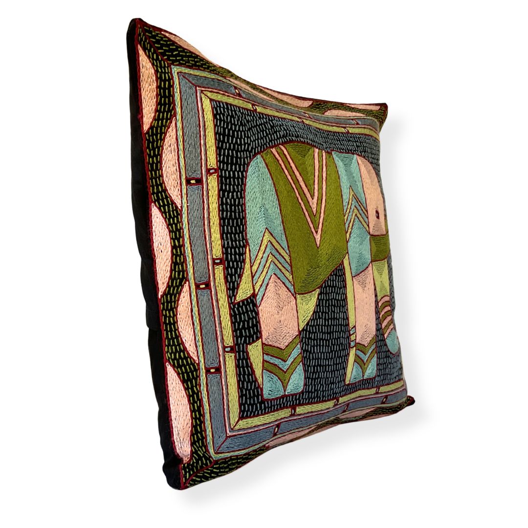 This cushion cover is a one-of-a-kind artwork. While the design is repeated within the collection, our skilled embroiderers interpret each piece individually, combining colors and stitches to create a truly unique item. The artwork features African animals, beautifully framed with the Kaross Signature geometric borders.