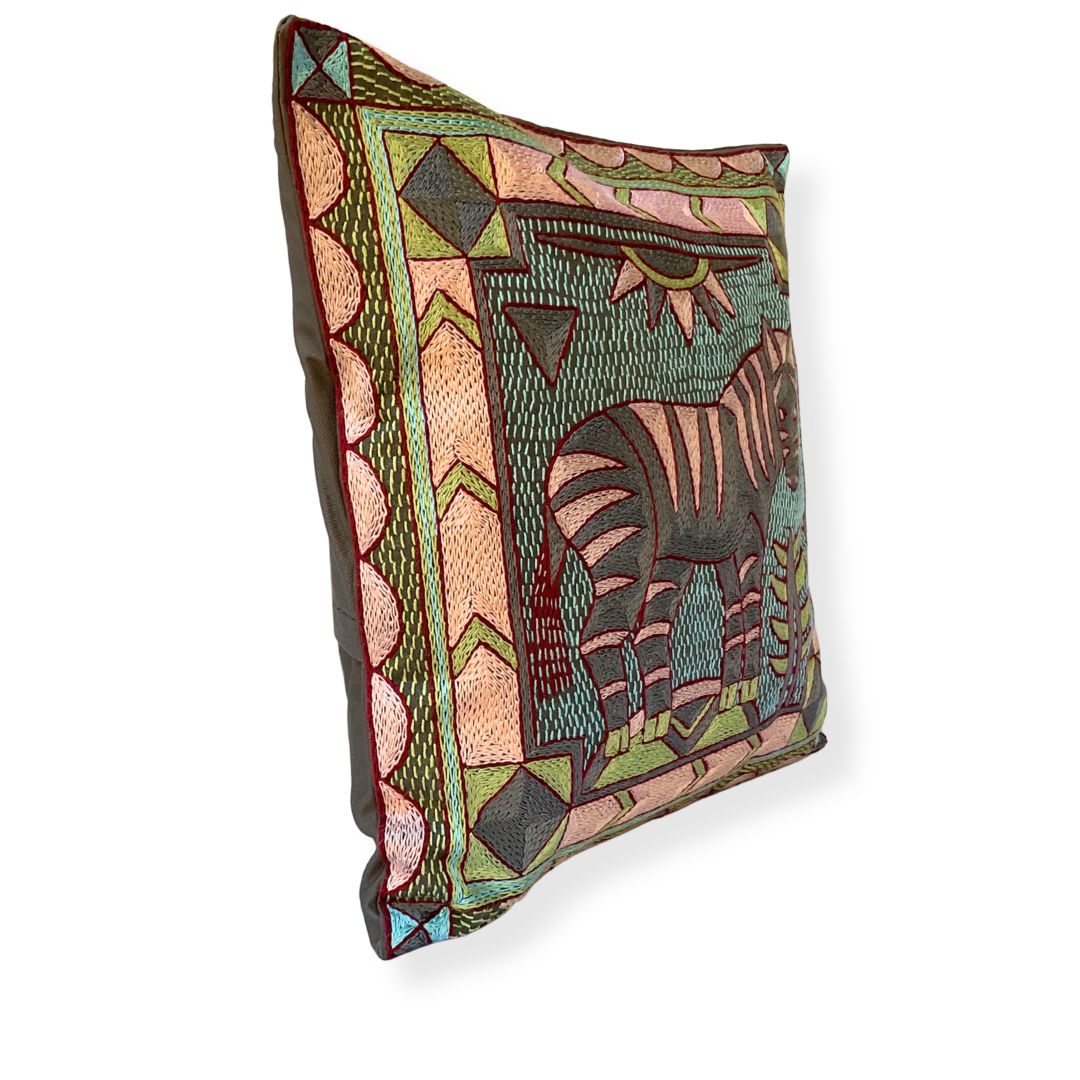 This cushion cover is a one-of-a-kind artwork. While the design is repeated within the collection, our skilled embroiderers interpret each piece individually, combining colors and stitches to create a truly unique item. The artwork features African animals, beautifully framed with the Kaross Signature geometric borders.