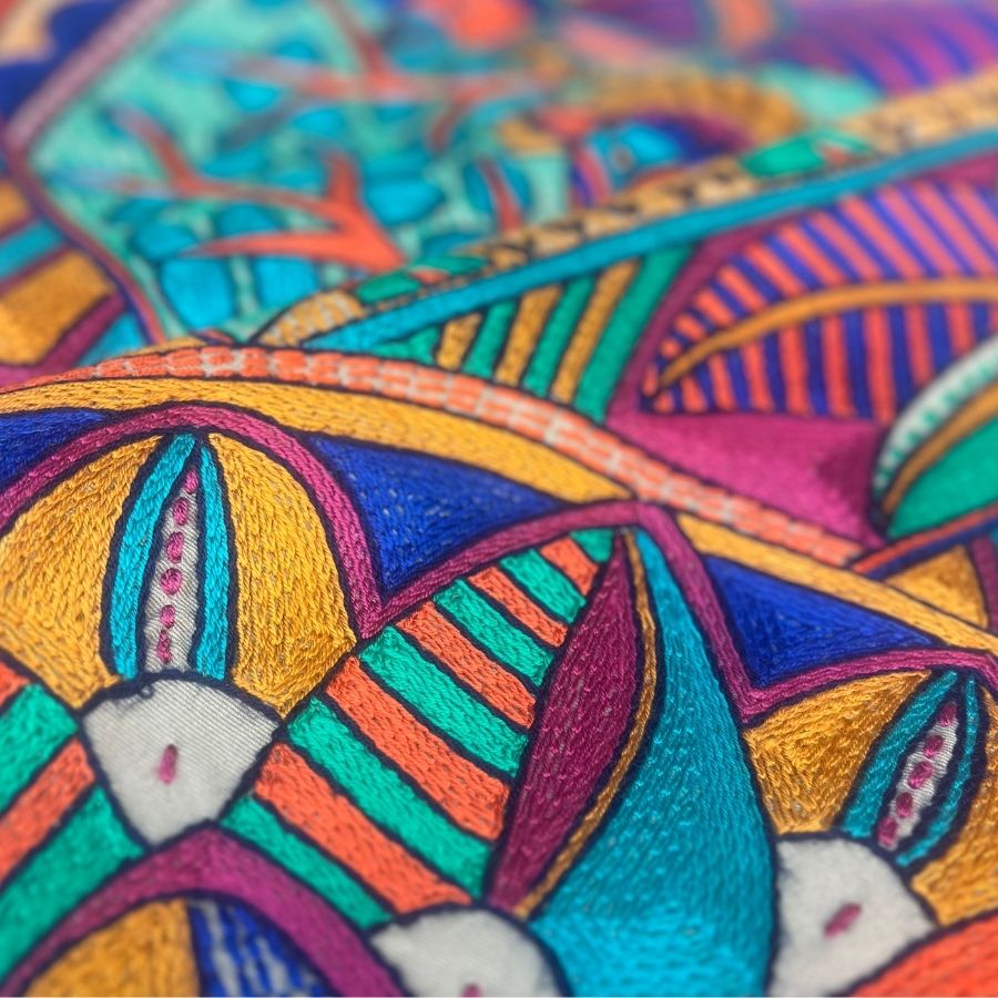 Material: 100% hand-embroidered with acrylic yarn on cotton fabric