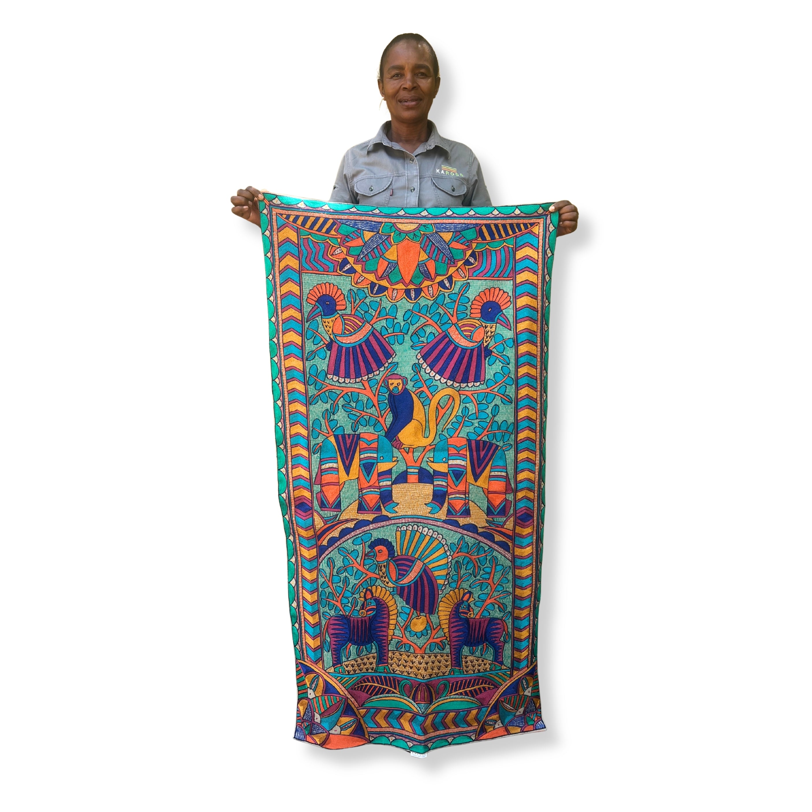 This cloth is a one-of-a-kind artwork, hand-drawn by one of our Kaross artists and intricately brought to life through embroidery. While part of the Kaross Signature Collection – recognizable by its bold geometric borders – each piece is uniquely interpreted, making every cloth a distinctive creation. This particular design features elephants, zebras, and birds in a vivid African landscape.