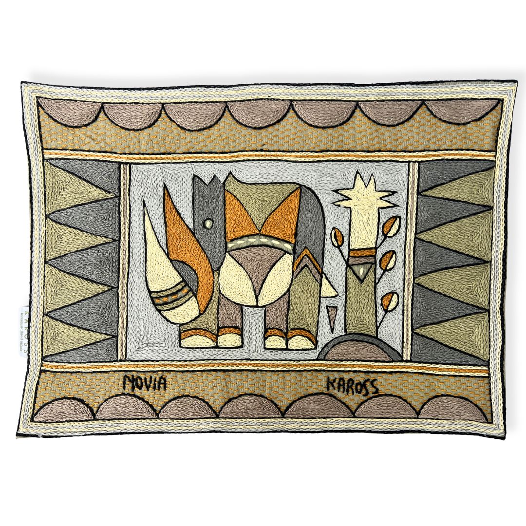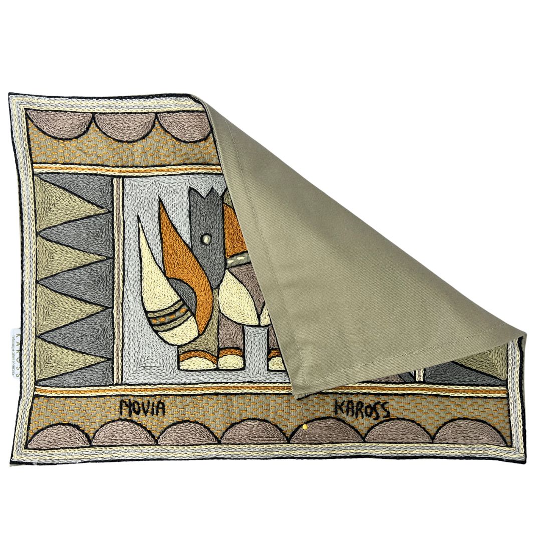 This placemat is a one-of-a-kind artwork. While the design is repeated within the collection, our skilled embroiderers interpret each piece individually, combining colors and stitches to create a truly unique item. Each embroiderer completes a matching set of 12 placemats. The artwork features African animals, beautifully framed with the Kaross Signature geometric borders.