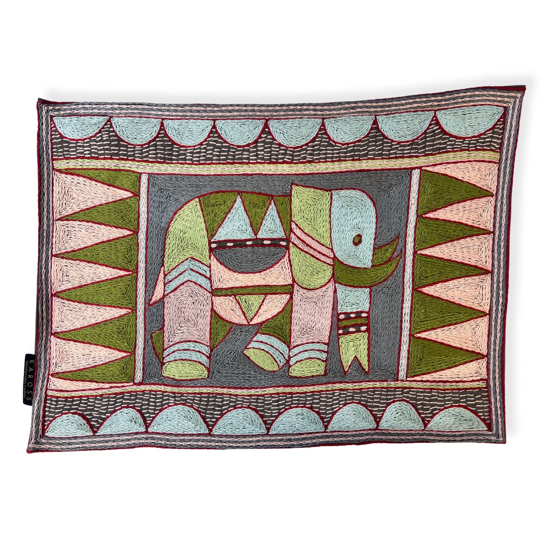 This placemat is a one-of-a-kind artwork. While the design is repeated within the collection, our skilled embroiderers interpret each piece individually, combining colors and stitches to create a truly unique item. Each embroiderer completes a matching set of 12 placemats. The artwork features African animals, beautifully framed with the Kaross Signature geometric borders.