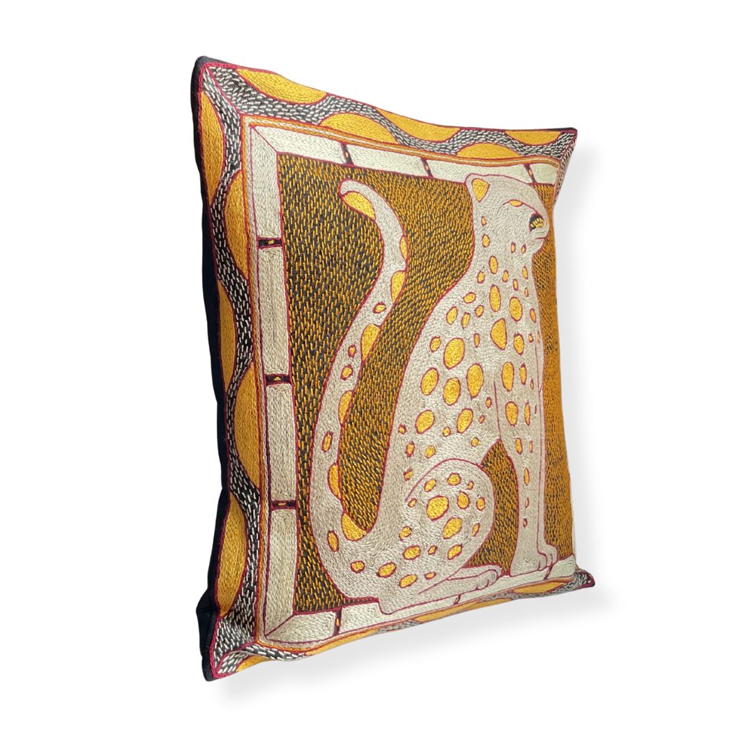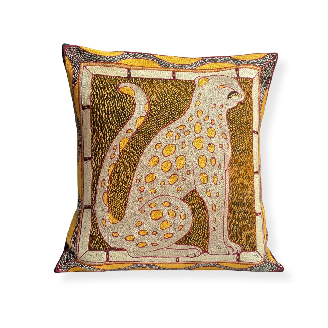 African Dawn Leopard Hand-Embroidered Cushion Cover