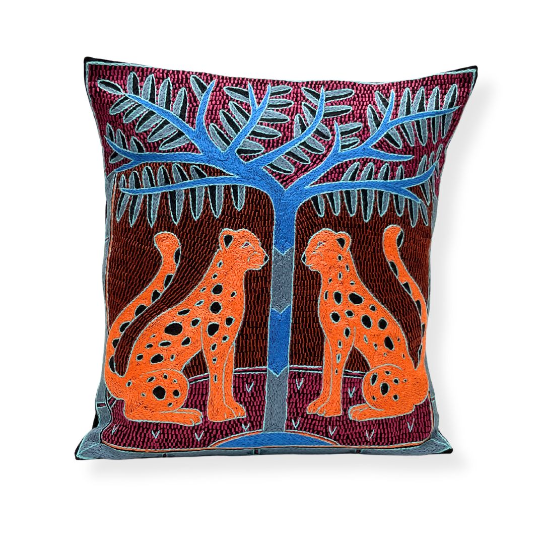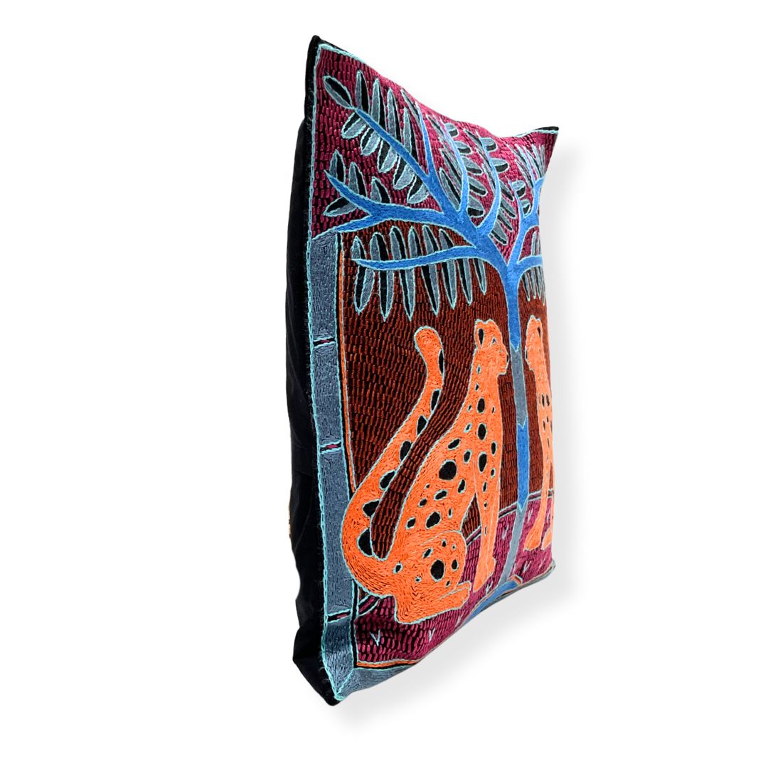 Bougainvillea Leopard Pair Hand-Embroidered Cushion Cover