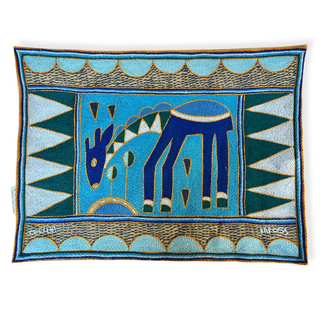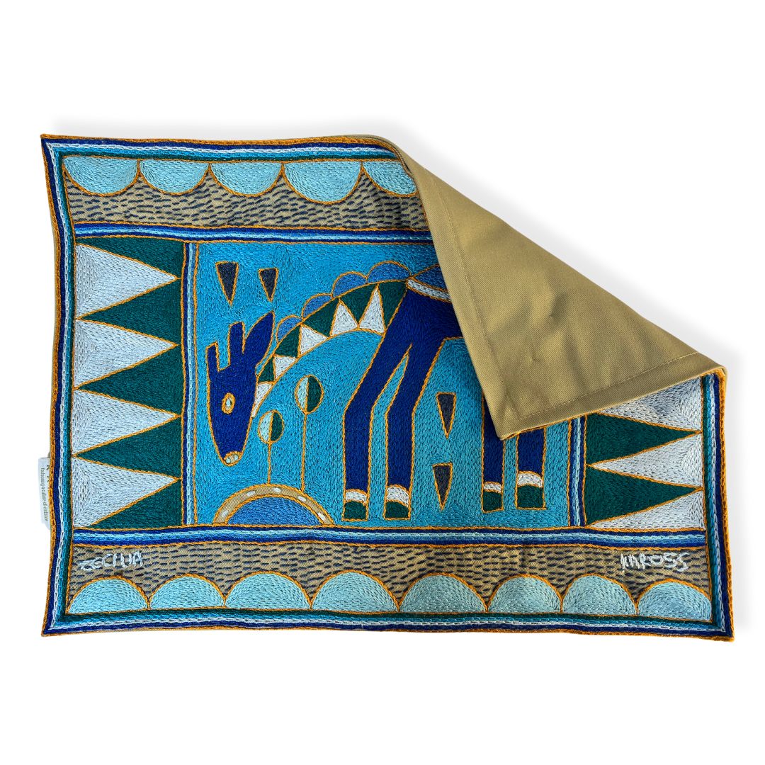 This placemat is a one-of-a-kind artwork. While the design is repeated within the collection, our skilled embroiderers interpret each piece individually, combining colors and stitches to create a truly unique item. Each embroiderer completes a matching set of 12 placemats. The artwork features African animals, beautifully framed with the Kaross Signature geometric borders.