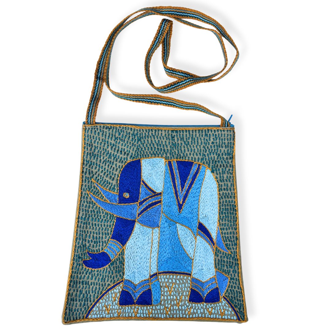 The Olivia bag is a one-of-a-kind, functional artwork. While the design is repeated within the collection, each piece is individually interpreted by our skilled embroiderers—carefully combining colours and stitches to create a truly unique item. This design features African animals and forms part of our Delpht colour range.