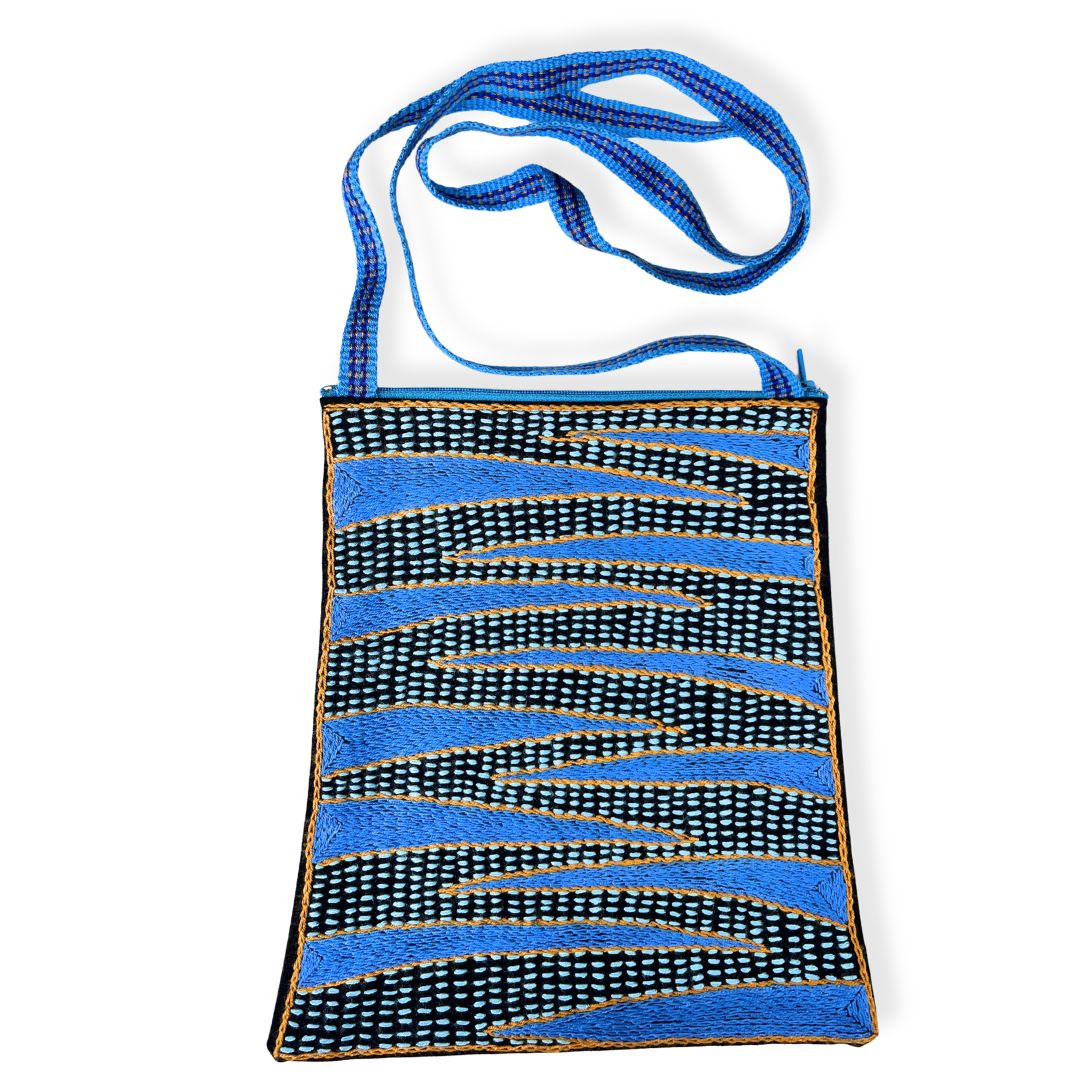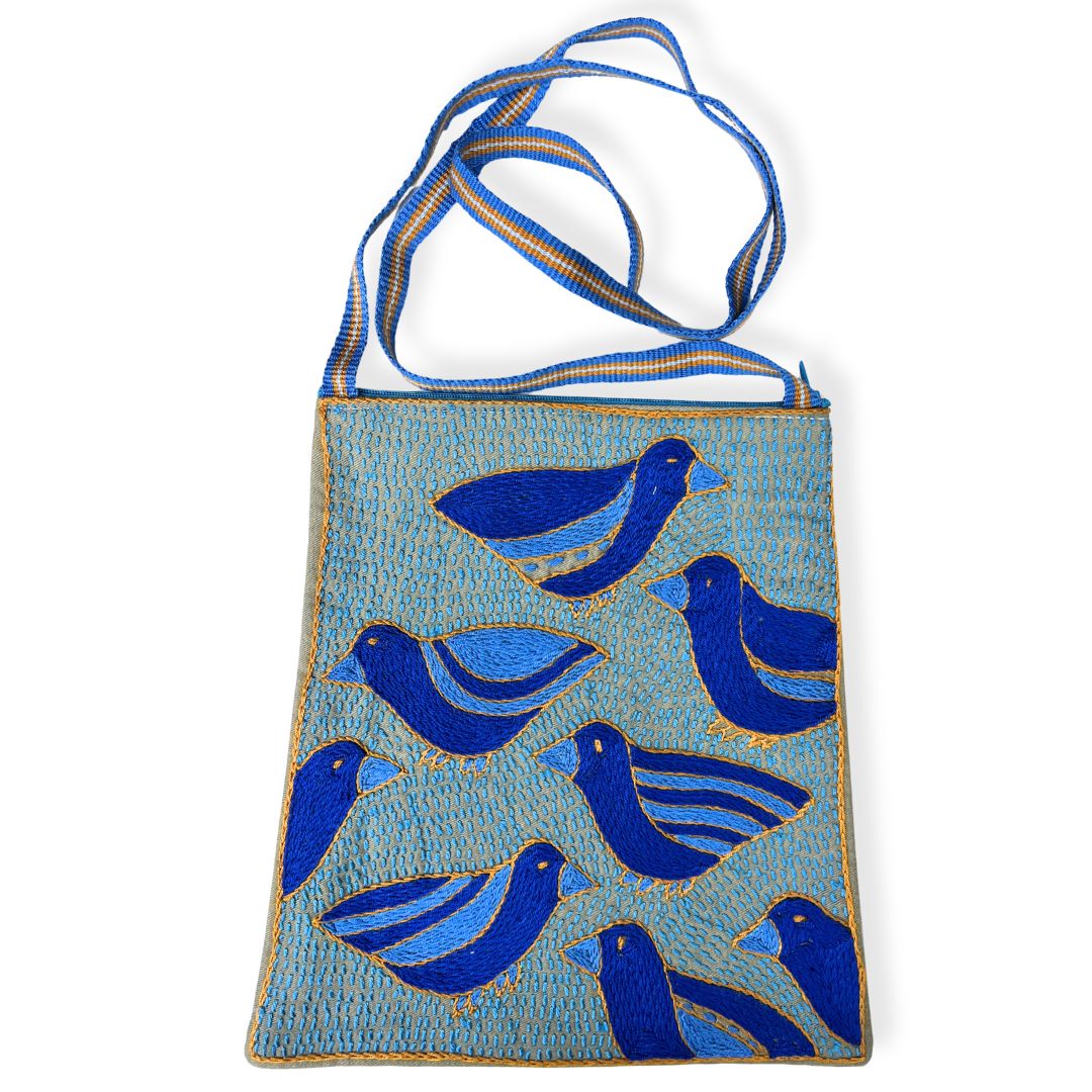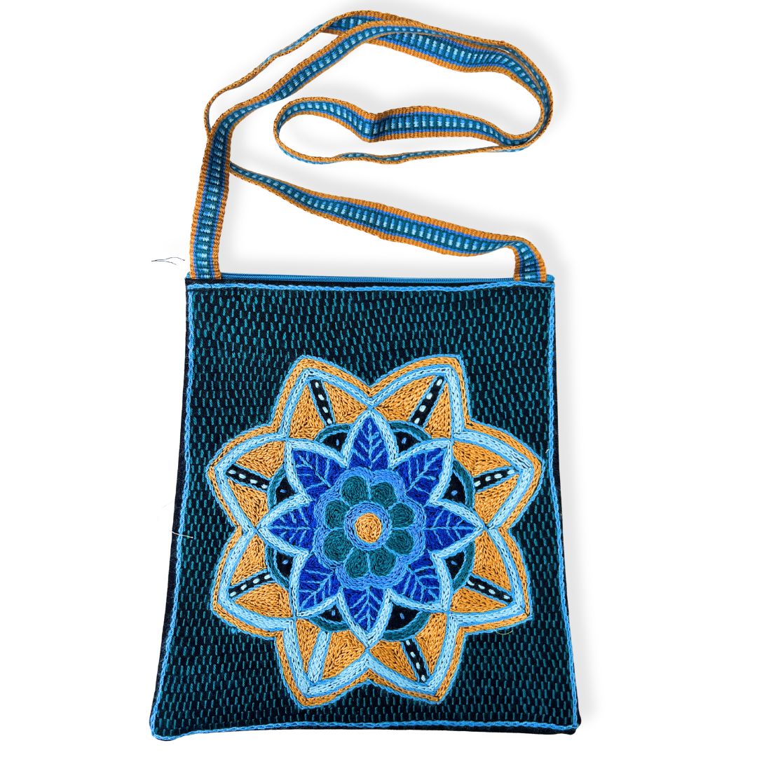 • Material: 100% hand-embroidered with acrylic yarn on cotton fabric, with a hand woven over the shoulder strap and zip finish