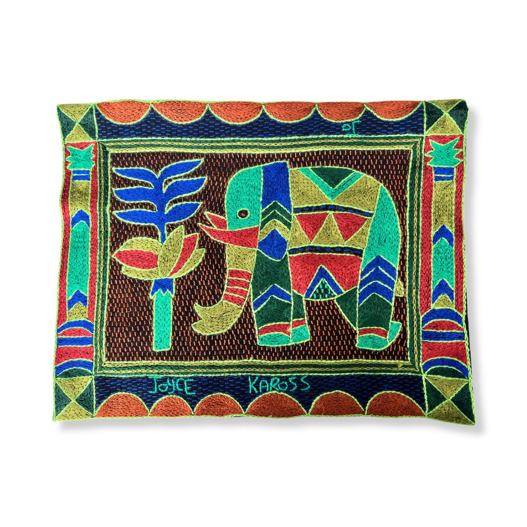 This placemat is a one-of-a-kind artwork. While the design is repeated within the collection, our skilled embroiderers interpret each piece individually, combining colors and stitches to create a truly unique item. Each embroiderer completes a matching set of 12 placemats. The artwork features African animals, beautifully framed with the Kaross Signature geometric borders.