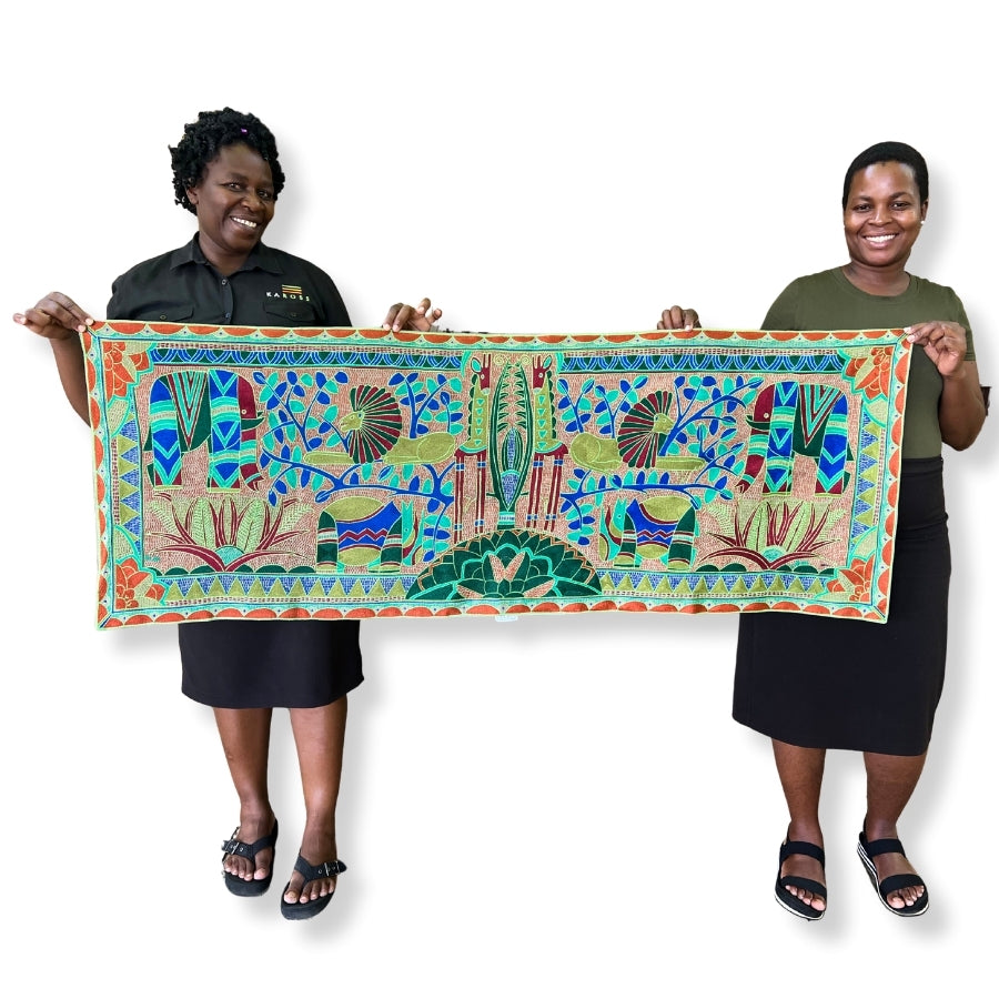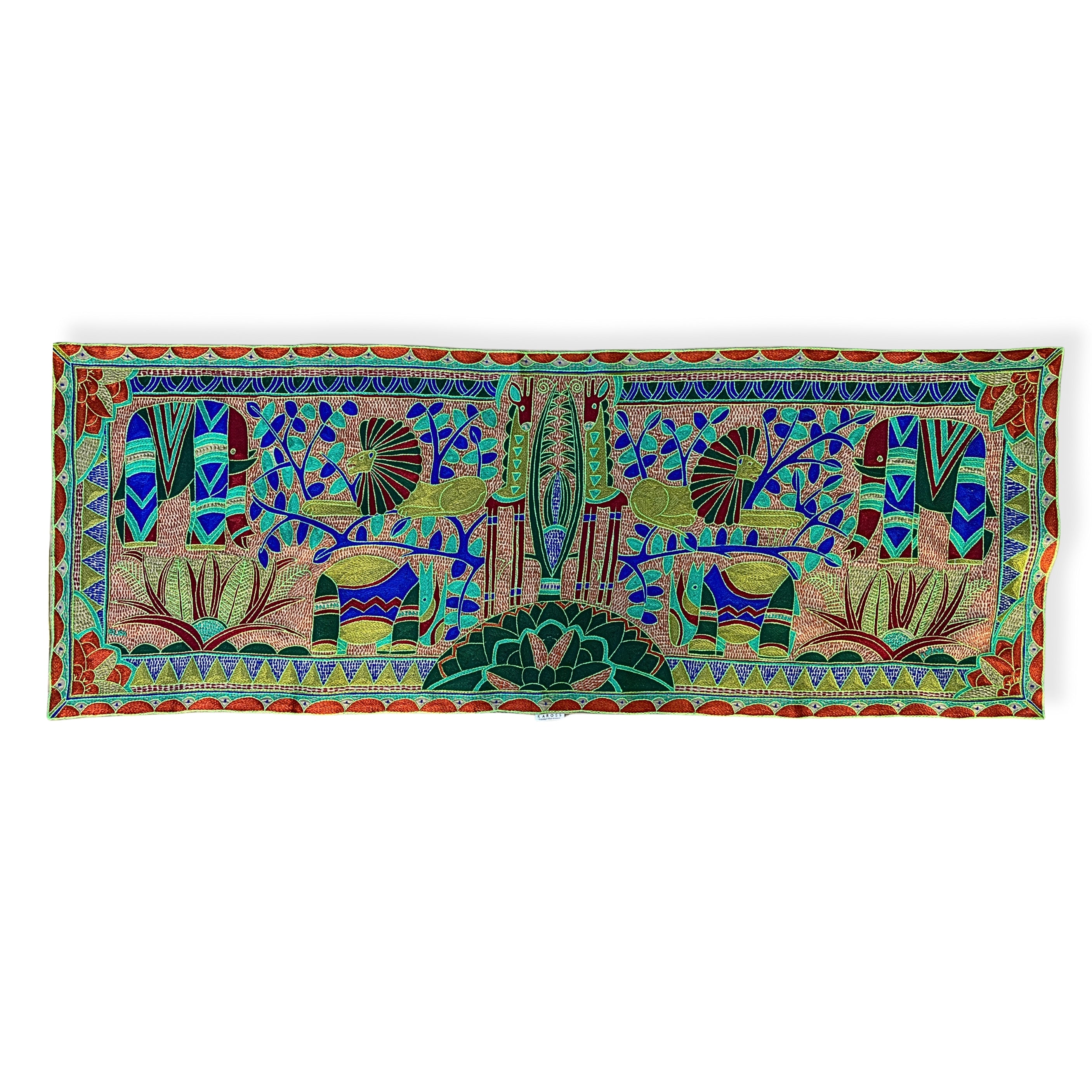 This cloth is a one-of-a-kind artwork, hand-drawn by one of our Kaross artists and carefully brought to life through embroidery. While the design is repeated within the Signature Collection, each piece is individually interpreted – making every cloth a unique creation. The artwork features wild African animals grazing in the bush under expansive African skies, beautifully framed with the Kaross Signature geometric borders.