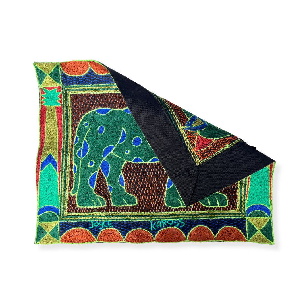This placemat is a one-of-a-kind artwork. While the design is repeated within the collection, our skilled embroiderers interpret each piece individually, combining colors and stitches to create a truly unique item. Each embroiderer completes a matching set of 12 placemats. The artwork features African animals, beautifully framed with the Kaross Signature geometric borders.