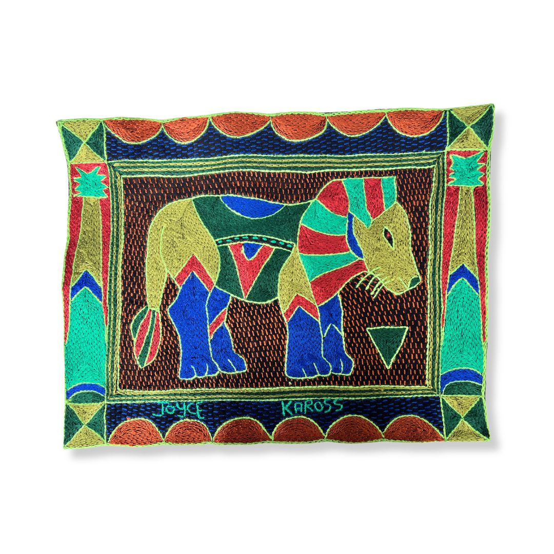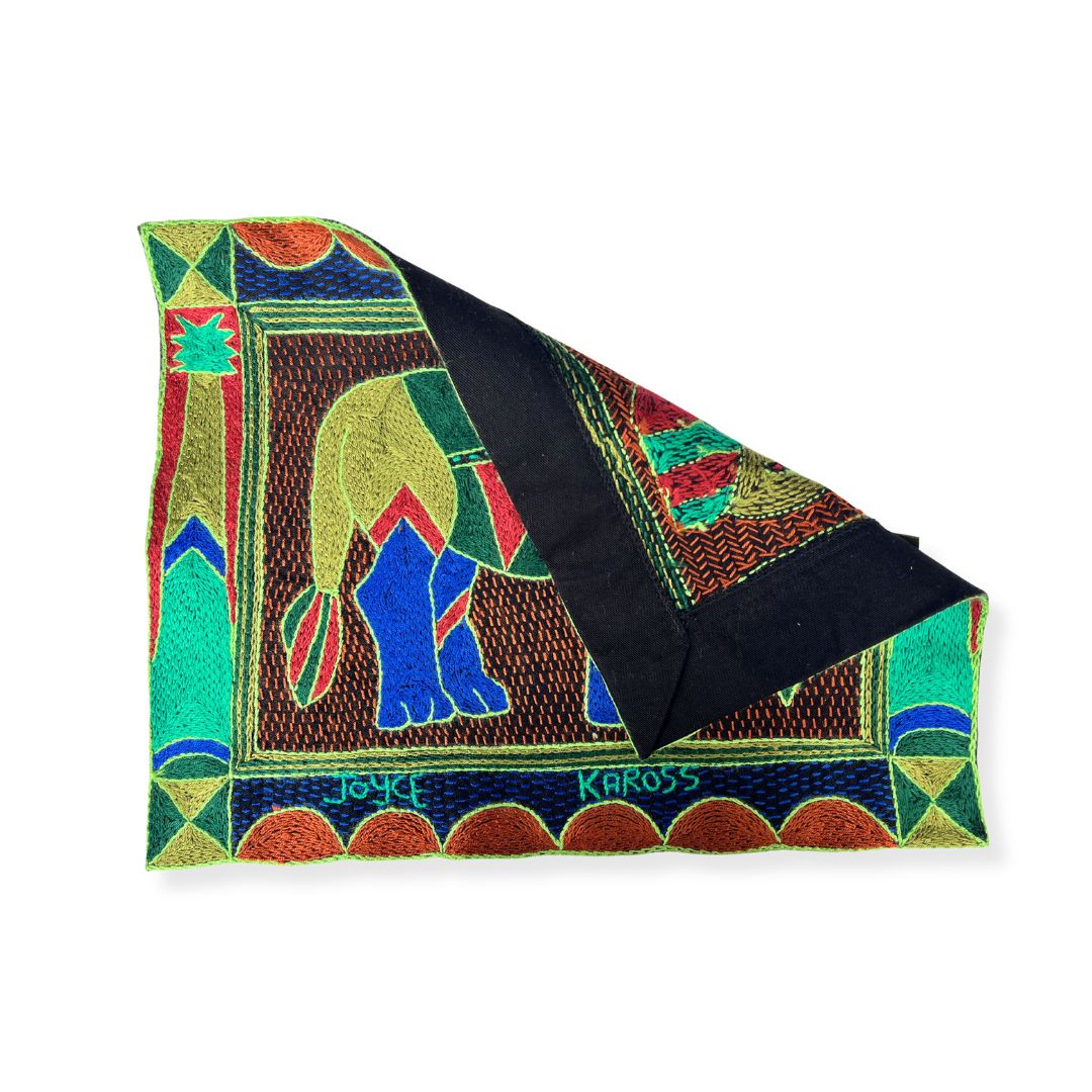 This placemat is a one-of-a-kind artwork. While the design is repeated within the collection, our skilled embroiderers interpret each piece individually, combining colors and stitches to create a truly unique item. Each embroiderer completes a matching set of 12 placemats. The artwork features African animals, beautifully framed with the Kaross Signature geometric borders.