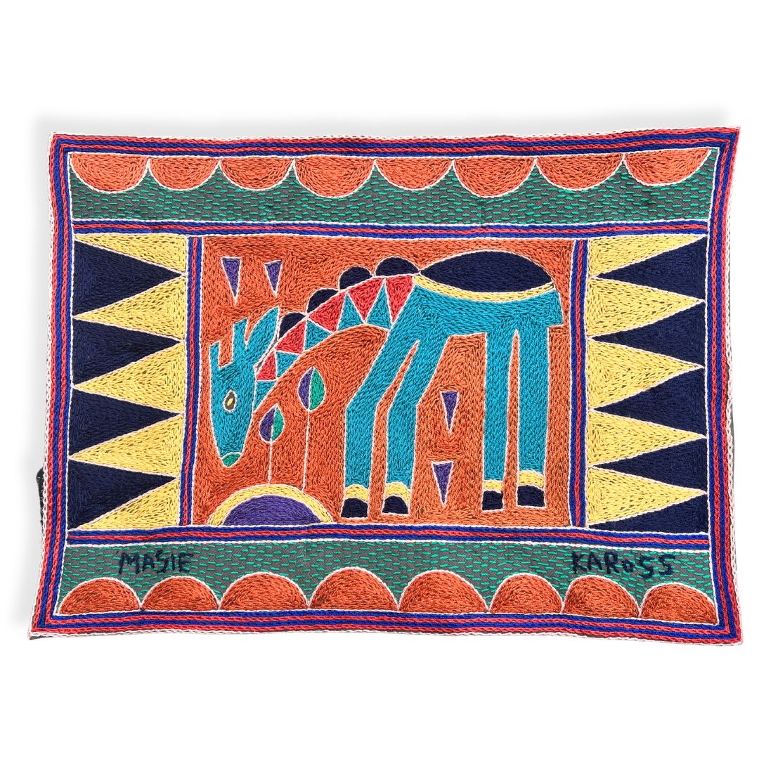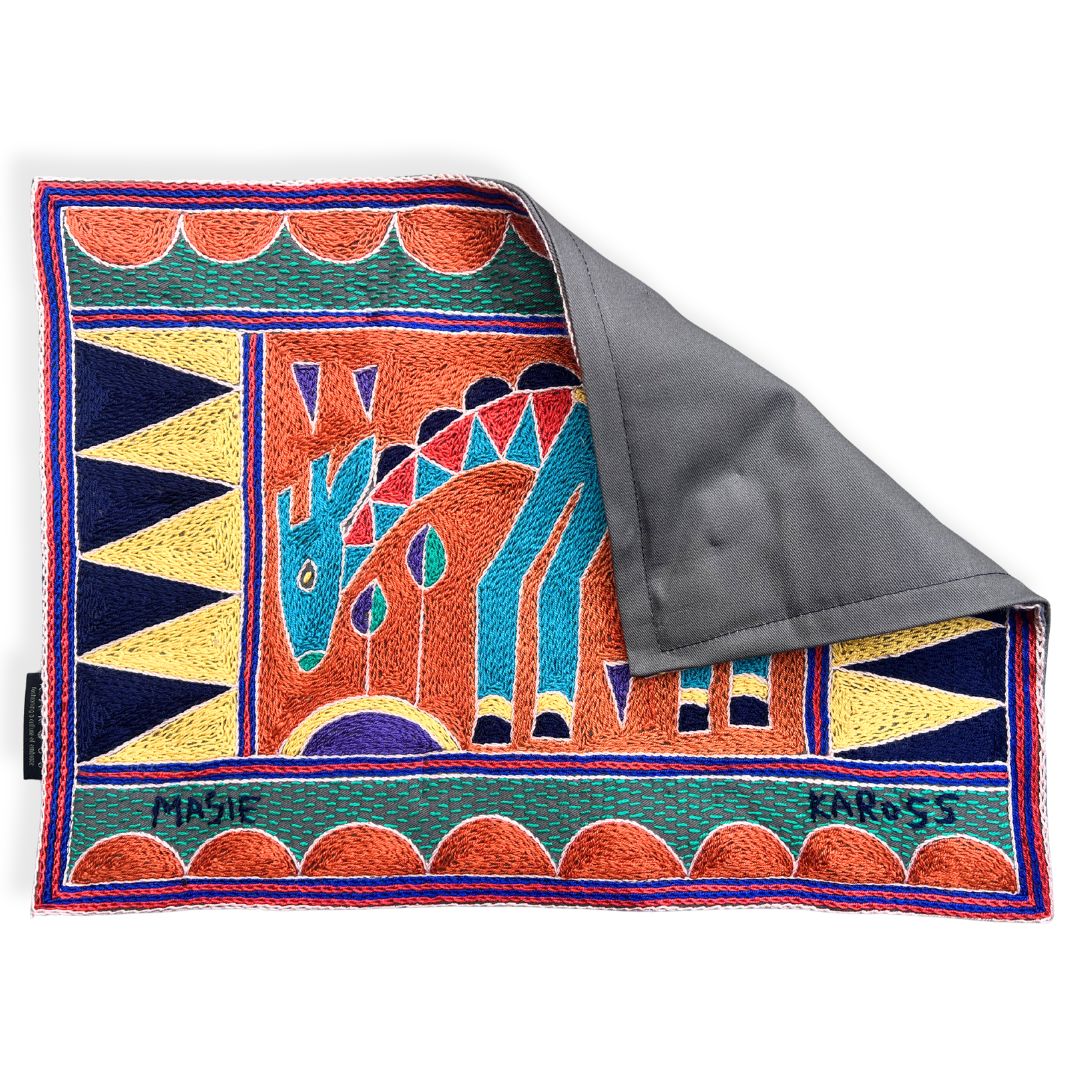 This placemat is a one-of-a-kind artwork. While the design is repeated within the collection, our skilled embroiderers interpret each piece individually, combining colors and stitches to create a truly unique item. Each embroiderer completes a matching set of 12 placemats. The artwork features African animals, beautifully framed with the Kaross Signature geometric borders.
