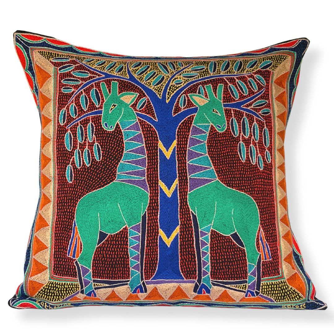 Happy Days Giraffes Grazing Large Hand-Embroidered Cushion Cover