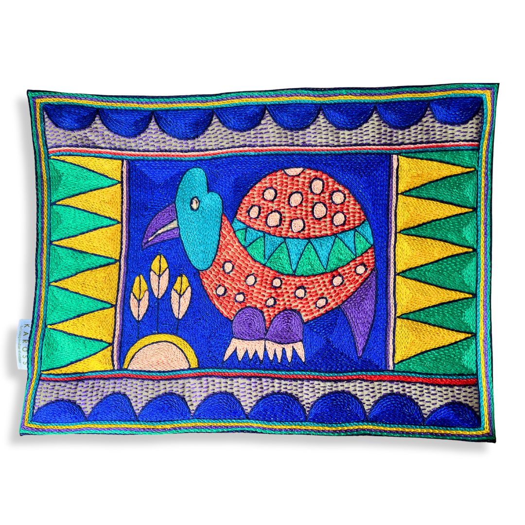 This placemat is a one-of-a-kind artwork. While the design is repeated within the collection, our skilled embroiderers interpret each piece individually, combining colors and stitches to create a truly unique item. Each embroiderer completes a matching set of 12 placemats. The artwork features African animals, beautifully framed with the Kaross Signature geometric borders.