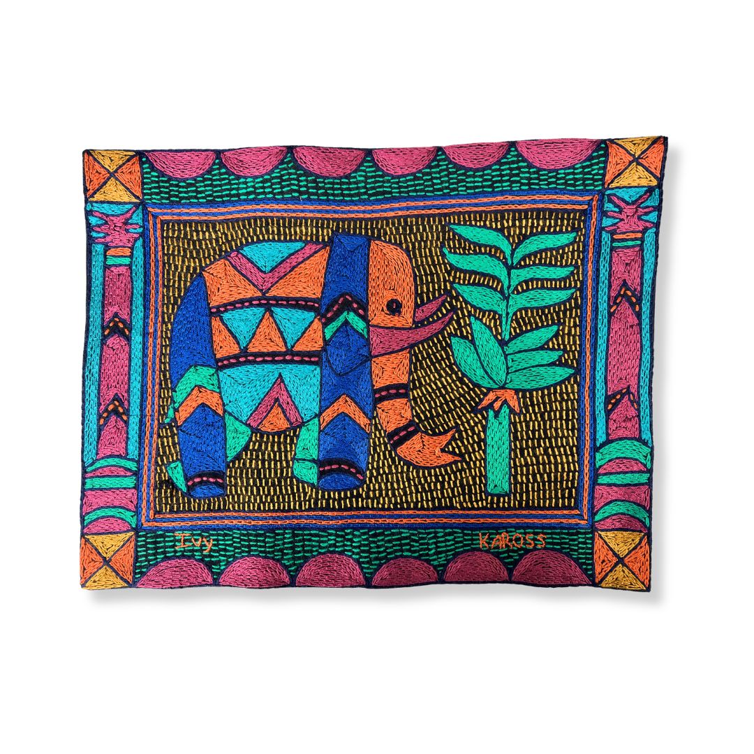 This placemat is a one-of-a-kind artwork. While the design is repeated within the collection, our skilled embroiderers interpret each piece individually, combining colors and stitches to create a truly unique item. Each embroiderer completes a matching set of 12 placemats. The artwork features African animals, beautifully framed with the Kaross Signature geometric borders.