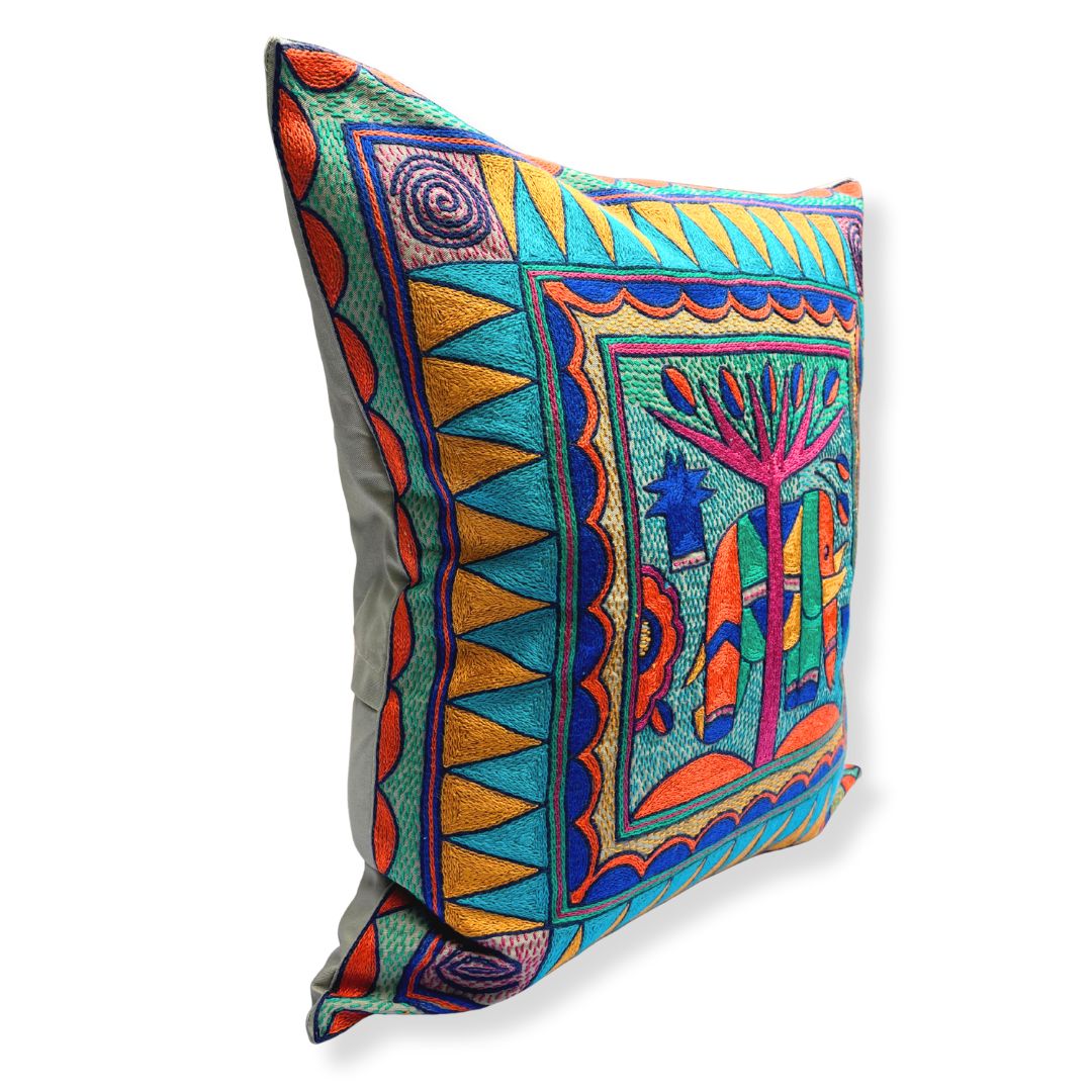 This cushion cover is a one-of-a-kind artwork. While the design is repeated within the collection, our skilled embroiderers interpret each piece individually, combining colors and stitches to create a truly unique item. The artwork features African animals, beautifully framed with the Kaross Signature geometric borders.