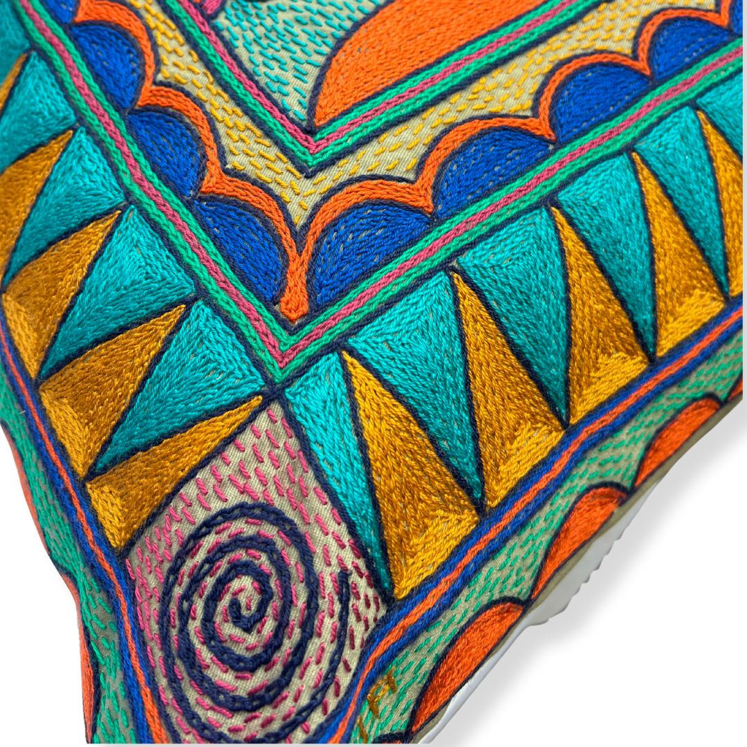 - Material: 100% hand-embroidered with acrylic yarn on cotton fabric