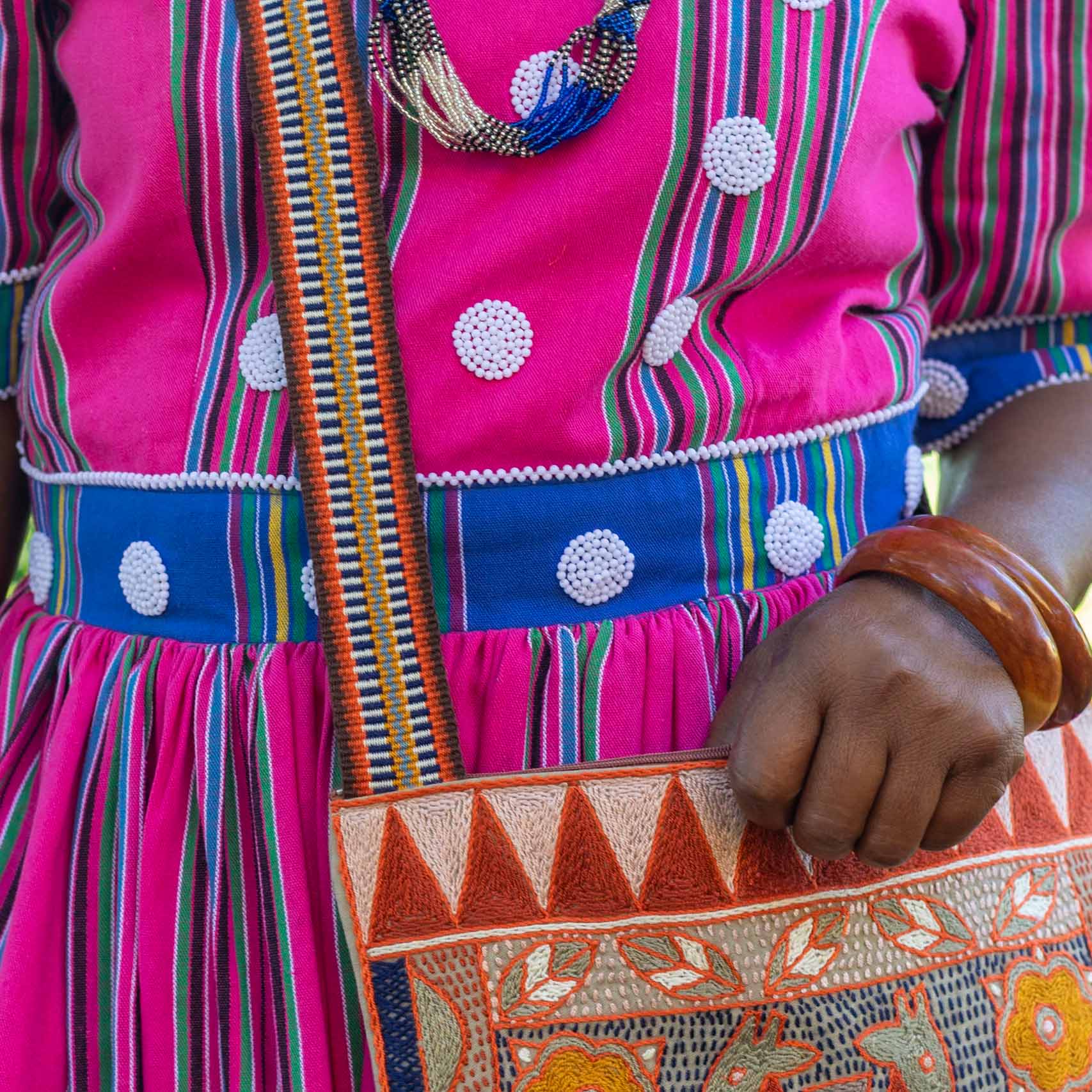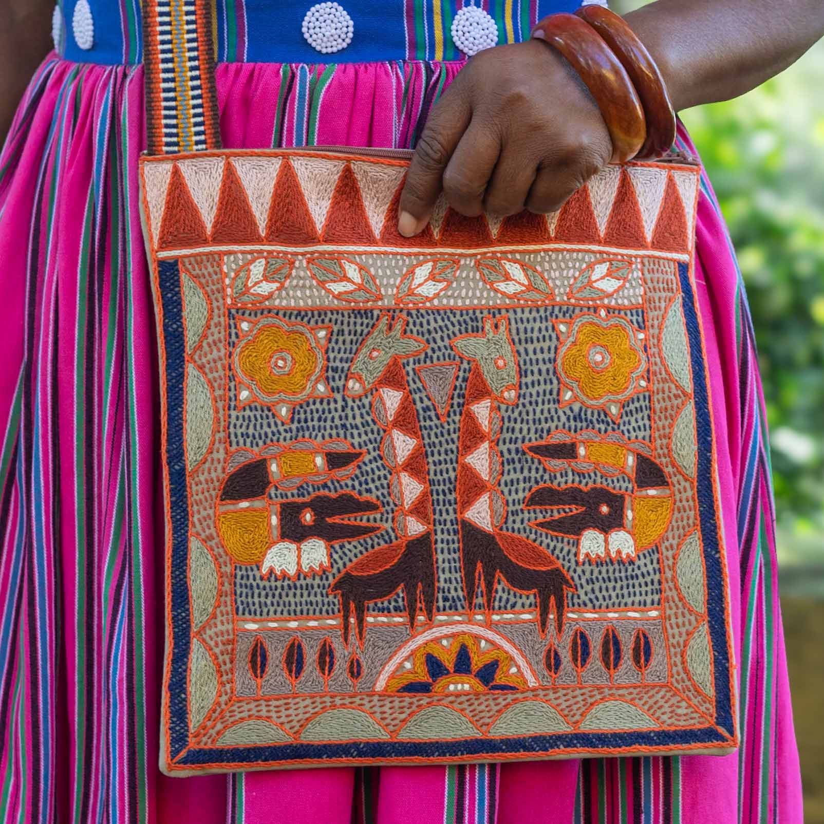 The Rejoice bag is a one-of-a-kind, functional artwork. While the design is repeated within the collection, each piece is individually interpreted by our skilled embroiderers—carefully combining colours and stitches to create a truly unique item. This design features African animals and forms part of our Namib Rust colour range.
