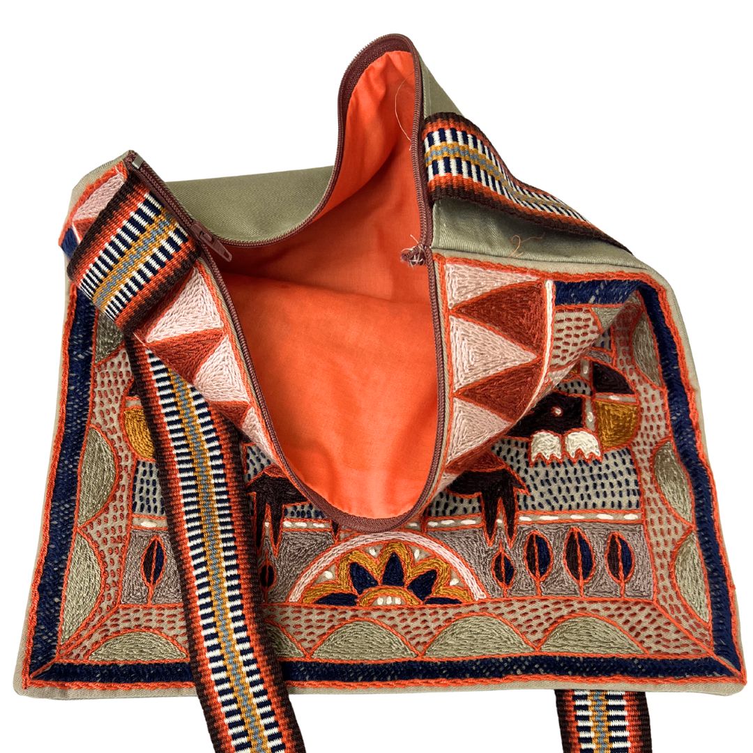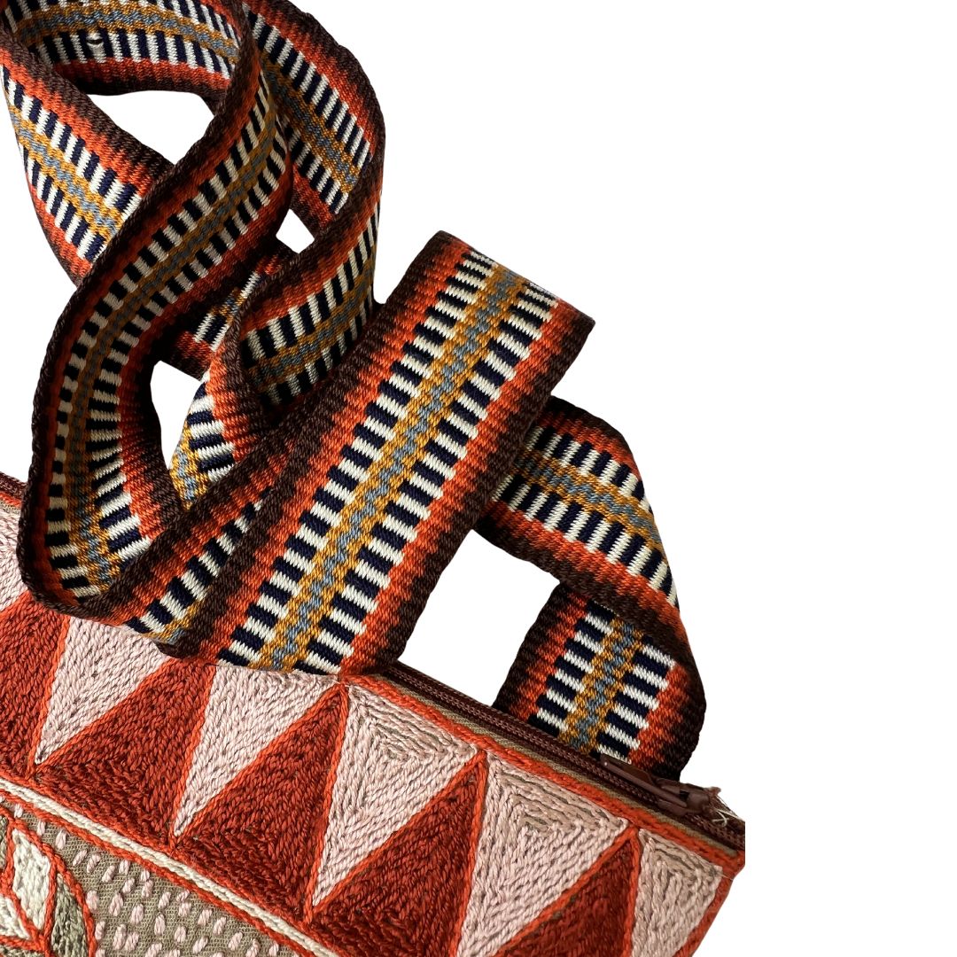 - Material: 100% hand-embroidered with acrylic yarn on cotton fabric, with a handwoven strap and a zip finish