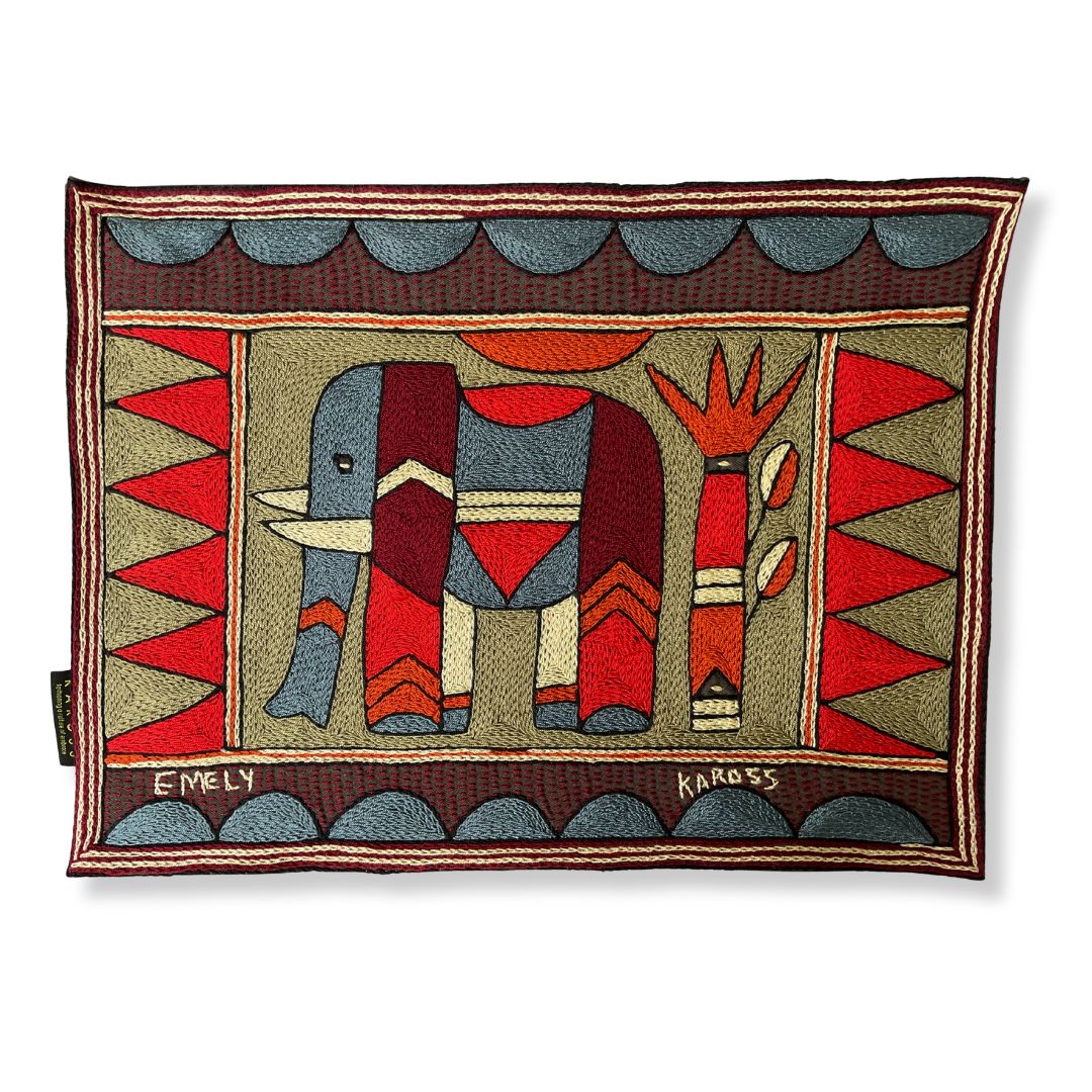 This placemat is a one-of-a-kind artwork. While the design is repeated within the collection, our skilled embroiderers interpret each piece individually, combining colors and stitches to create a truly unique item. Each embroiderer completes a matching set of 12 placemats. The artwork features African animals, beautifully framed with the Kaross Signature geometric borders.