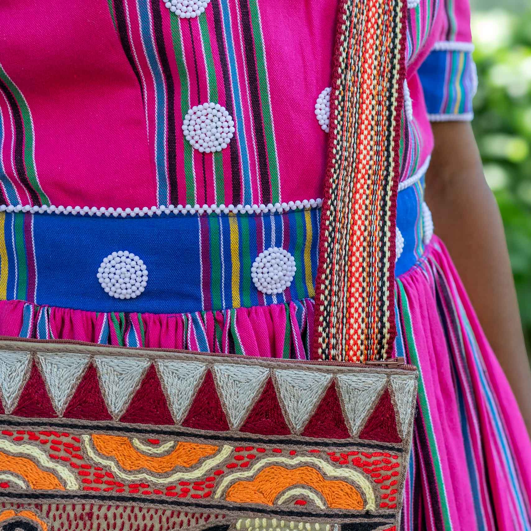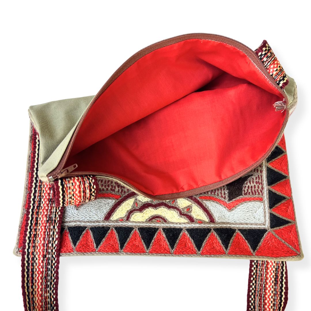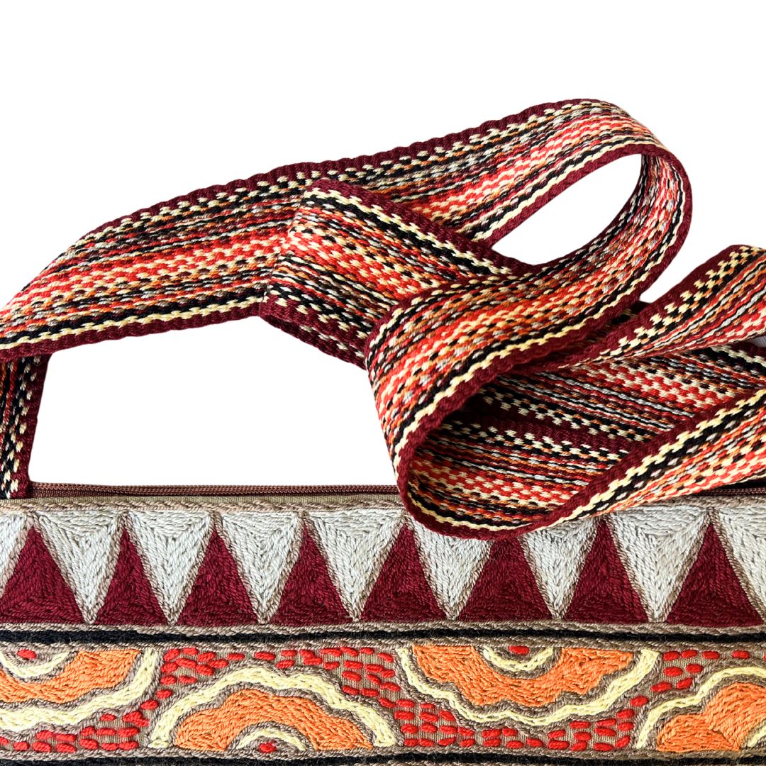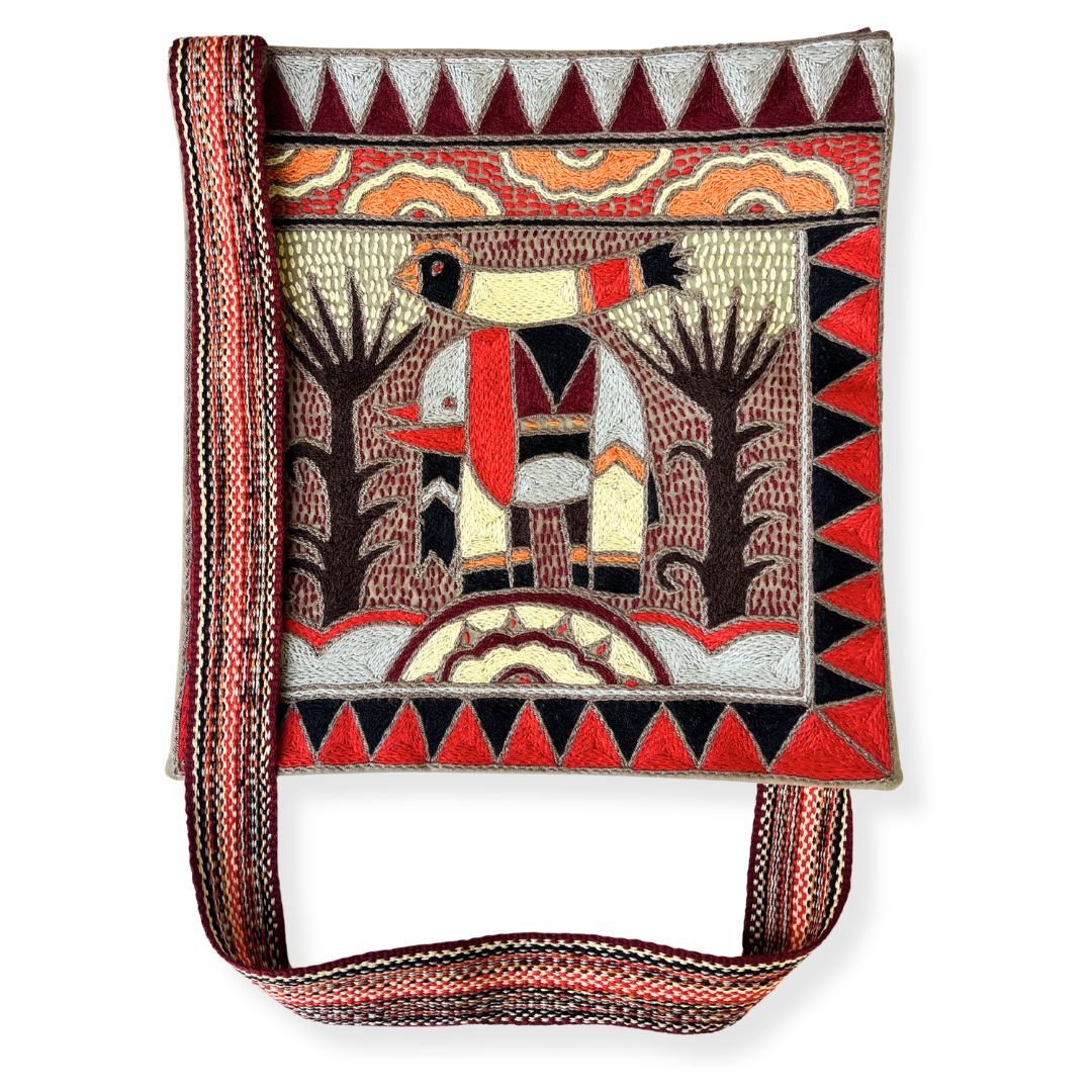 - Material: 100% hand-embroidered with acrylic yarn on cotton fabric, with a handwoven strap and a zip finish