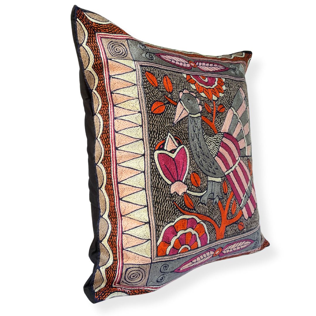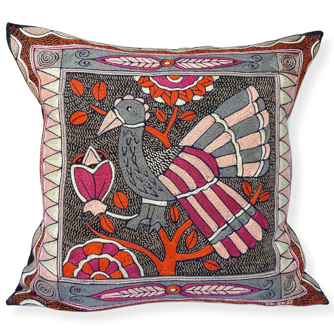 Ruby Sunset Bird in a Tree Hand-Embroidered Cushion Cover