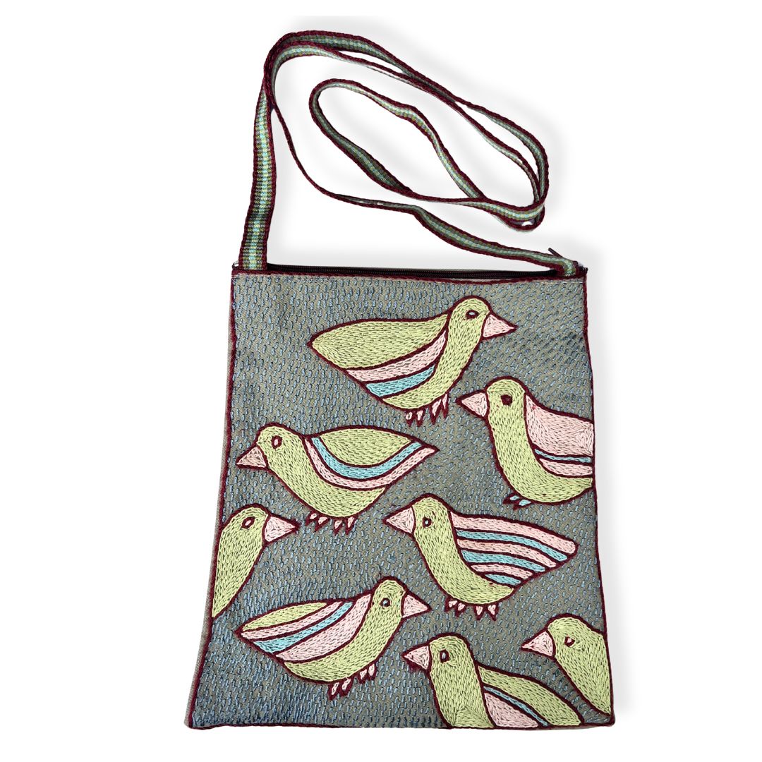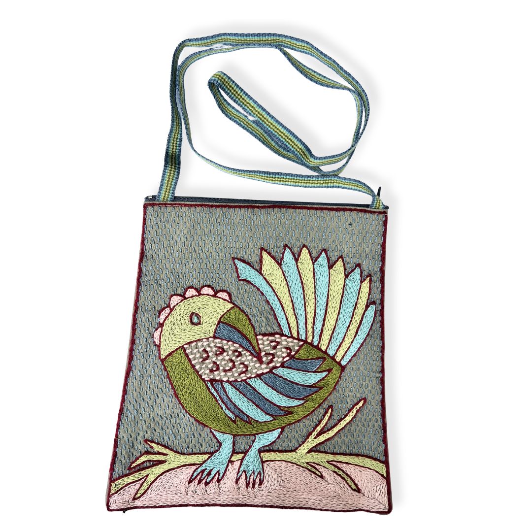 • Material: 100% hand-embroidered with acrylic yarn on cotton fabric, with a hand woven over the shoulder strap and zip finish