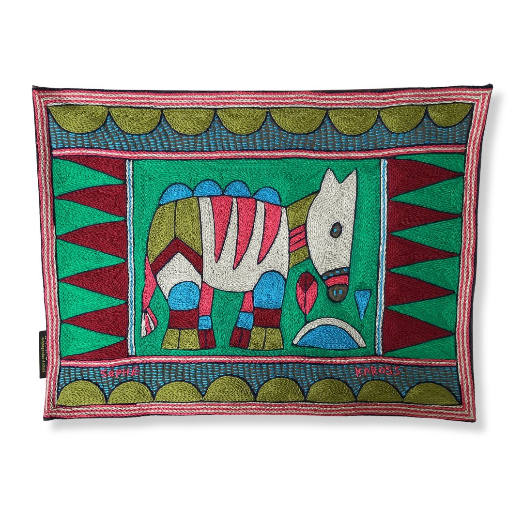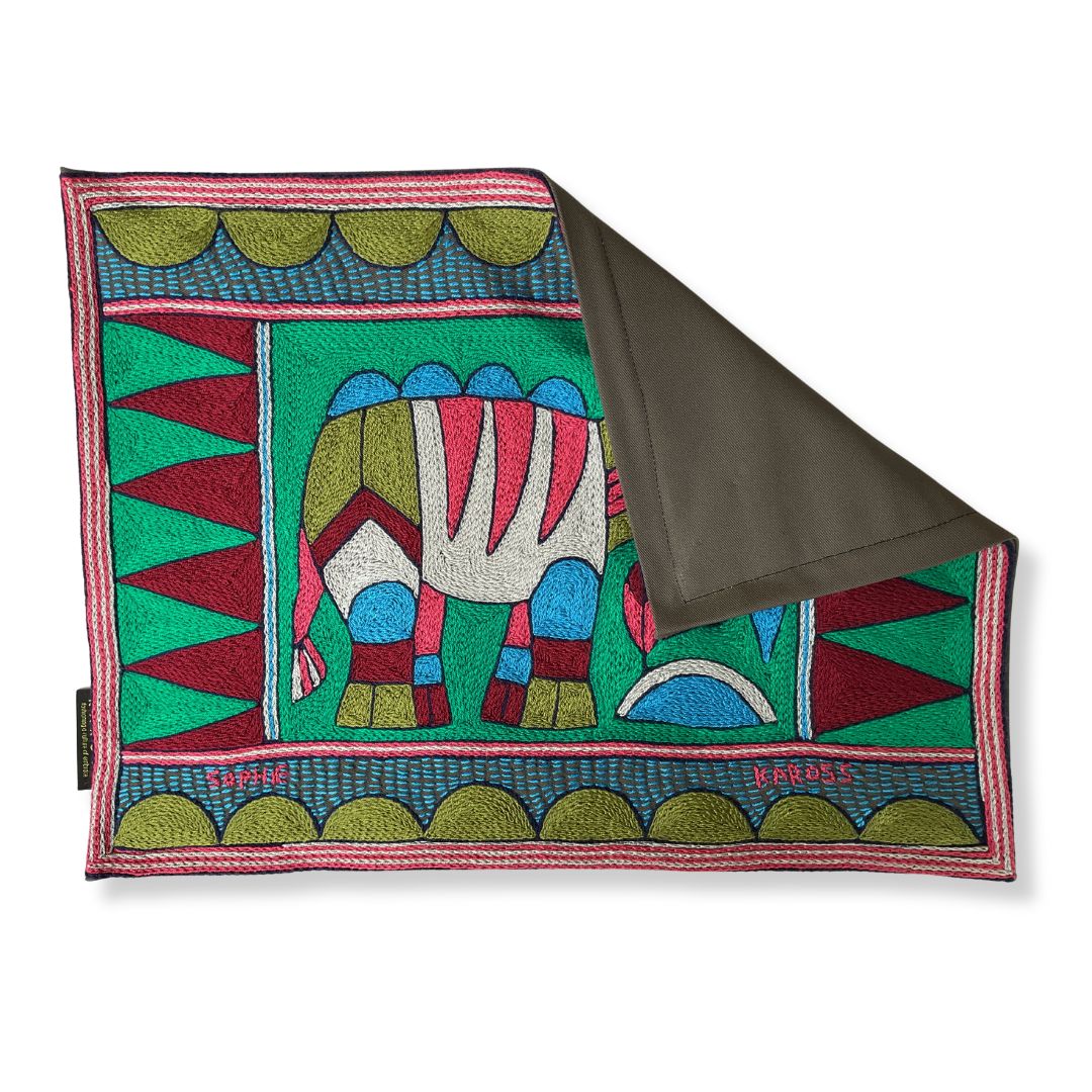 This placemat is a one-of-a-kind artwork. While the design is repeated within the collection, our skilled embroiderers interpret each piece individually, combining colors and stitches to create a truly unique item. Each embroiderer completes a matching set of 12 placemats. The artwork features African animals, beautifully framed with the Kaross Signature geometric borders.
