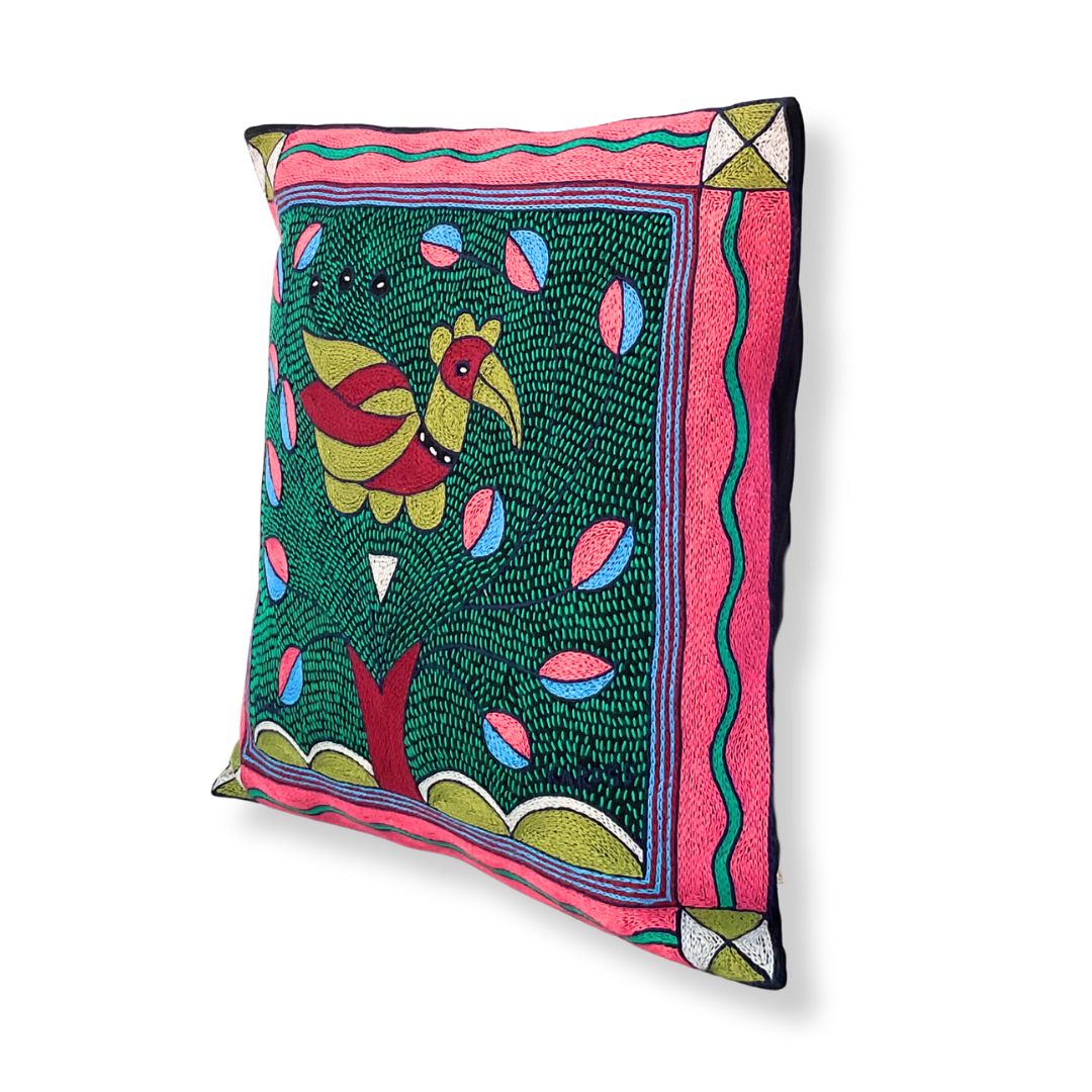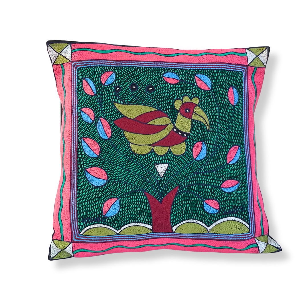 Turaco Bird in a Bush Hand-Embroidered Cushion Cover