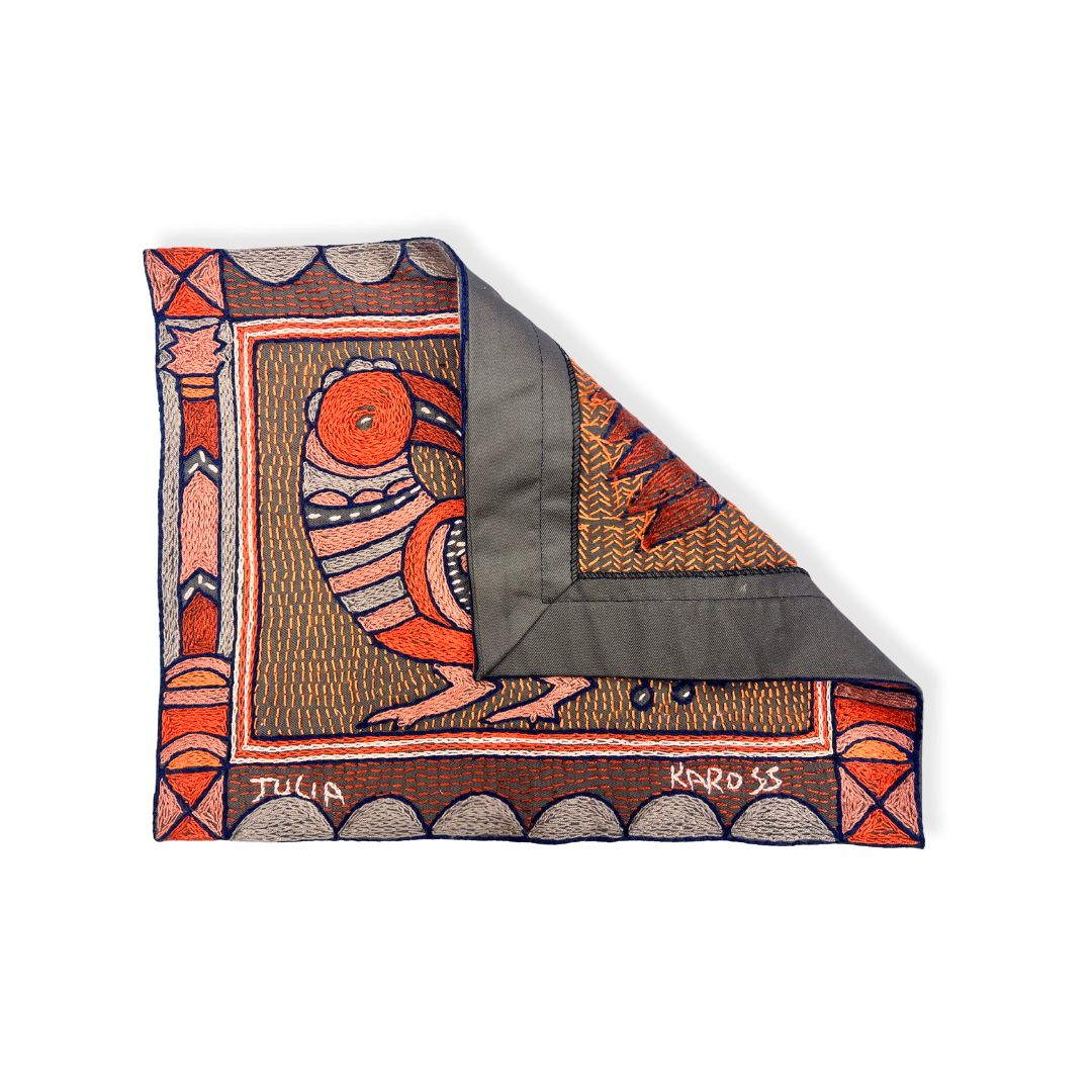 This placemat is a one-of-a-kind artwork. While the design is repeated within the collection, our skilled embroiderers interpret each piece individually, combining colors and stitches to create a truly unique item. Each embroiderer completes a matching set of 12 placemats. The artwork features African animals, beautifully framed with the Kaross Signature geometric borders.
