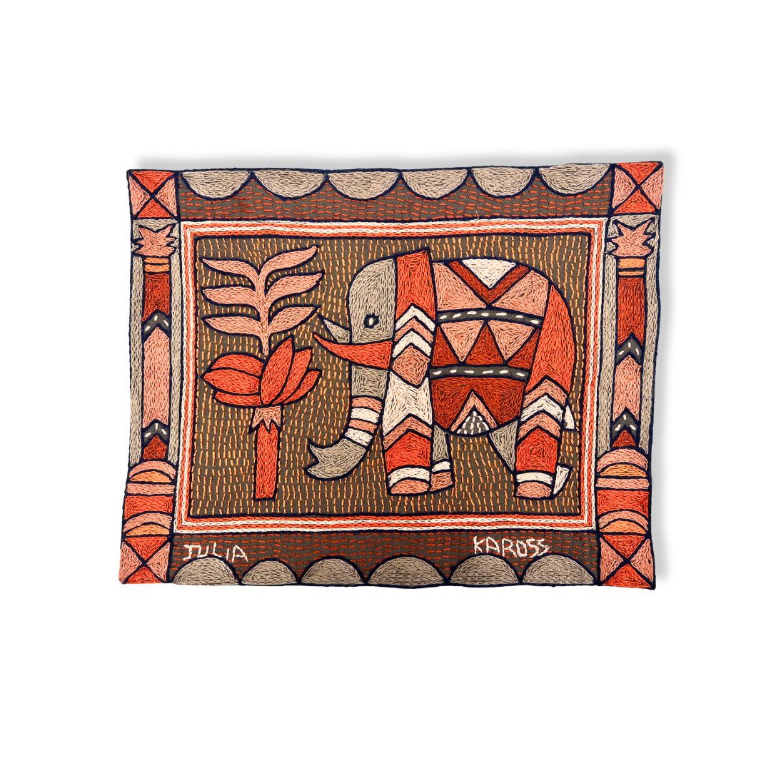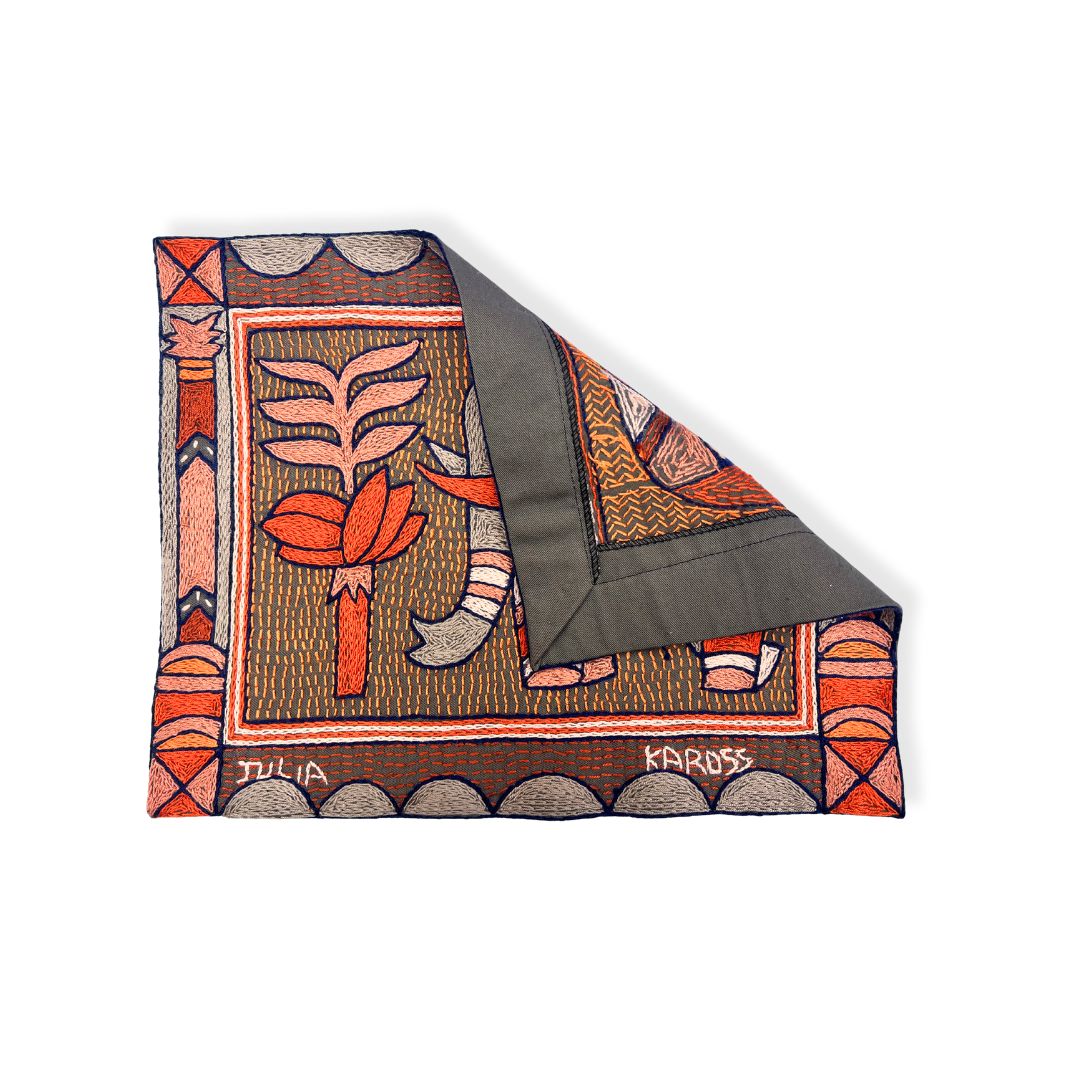 This placemat is a one-of-a-kind artwork. While the design is repeated within the collection, our skilled embroiderers interpret each piece individually, combining colors and stitches to create a truly unique item. Each embroiderer completes a matching set of 12 placemats. The artwork features African animals, beautifully framed with the Kaross Signature geometric borders.